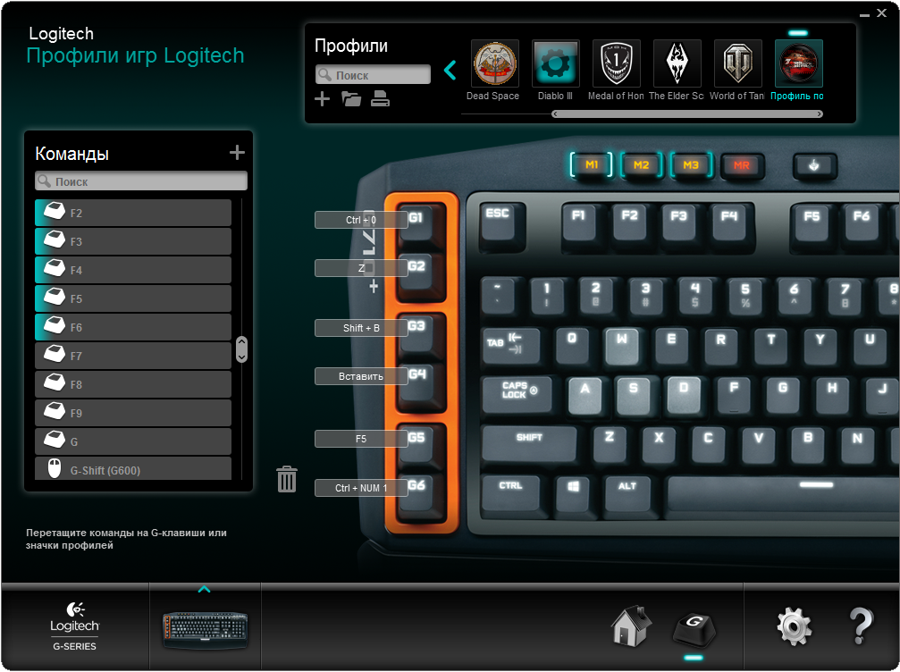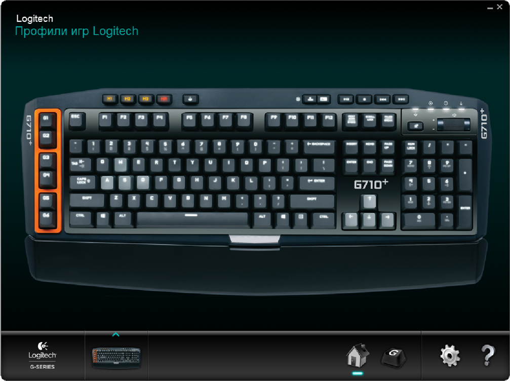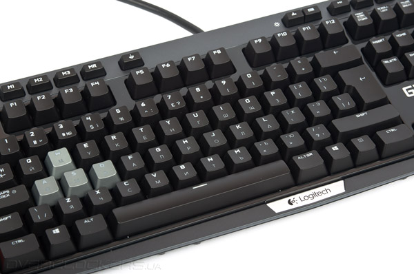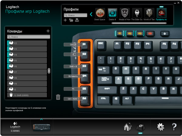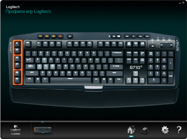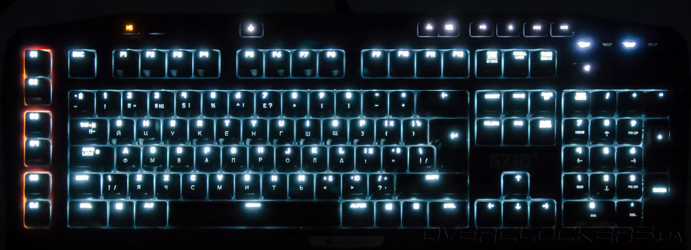 Слева помещён блок программируемых G-клавиш, состоящий из шести элементов (G1-G6). Они могут применяться как в играх, так и в повседневной работе. Часть команд подвязывается через фирменное ПО Logitech Gaming Software, макросы создаются «на лету».