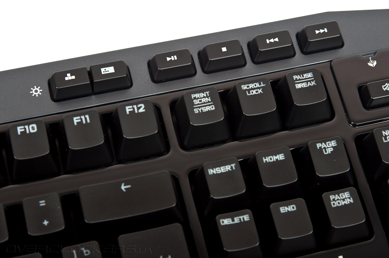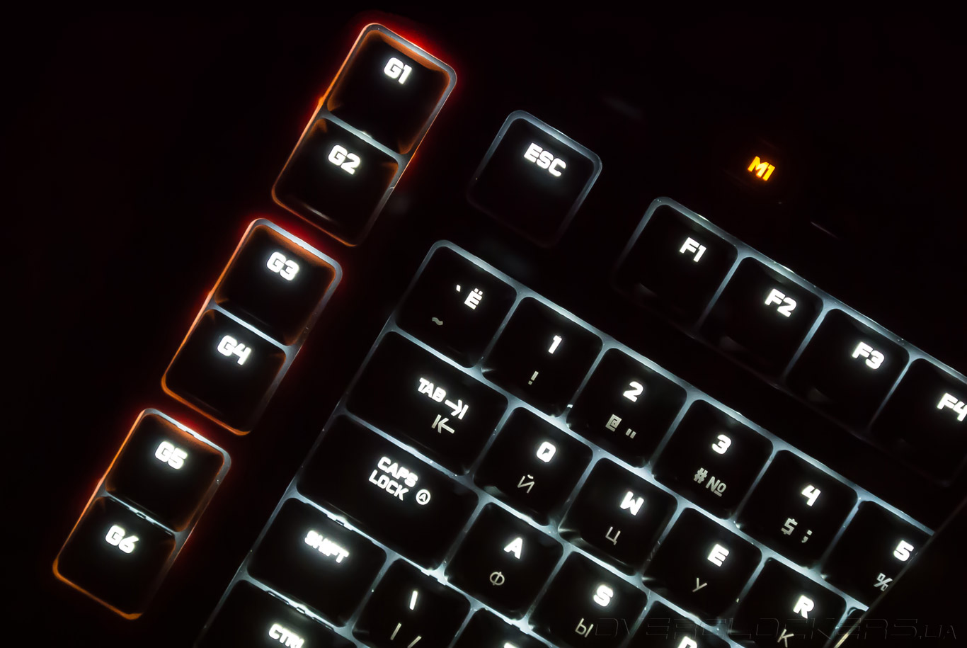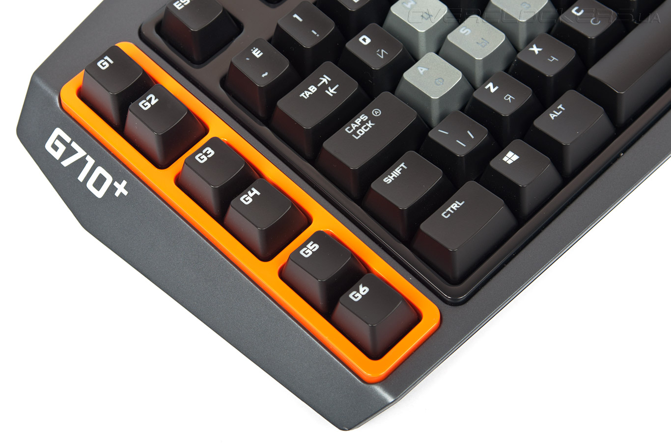 Слева помещён блок программируемых G-клавиш, состоящий из шести элементов (G1-G6). Они могут применяться как в играх, так и в повседневной работе. Часть команд подвязывается через фирменное ПО Logitech Gaming Software, макросы создаются «на лету».