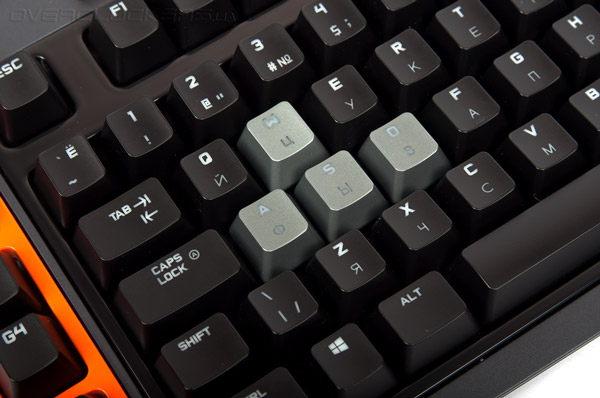Часто используемые в играх клавиши WASD и блок стрелок специально окрашены в светло-серый цвет для того, чтобы геймер мог визуально определить их местонахождение при беглом взгляде на раскладку.
