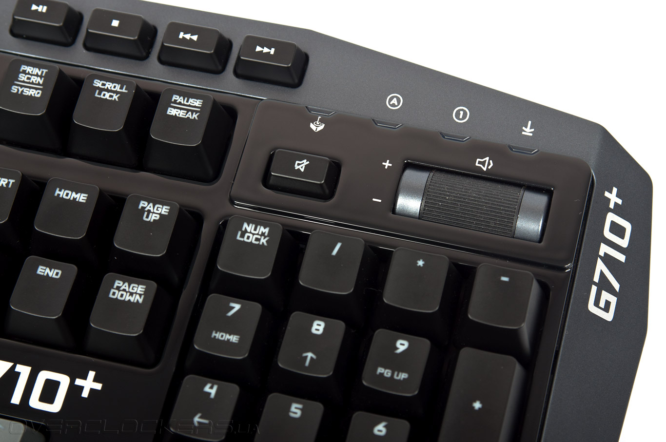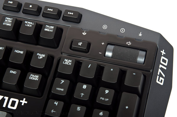 Дополняет ряд мультимедийных кнопок ещё один интересный элемент, находящийся между цифровым блоком клавиш и индикаторами CapsLock, NumLock, GameMode и ScrollLock. Регулятор громкости представлен в виде вертикально прокручивающегося барабана. Скорость прокрутки умеренная с плавным ходом. Рядом с регулятором громкости мы видим клавишу Mute, то есть полное отключение звука.