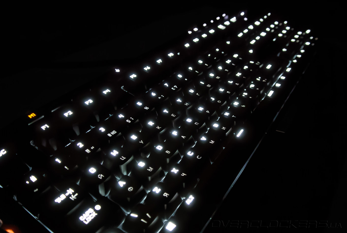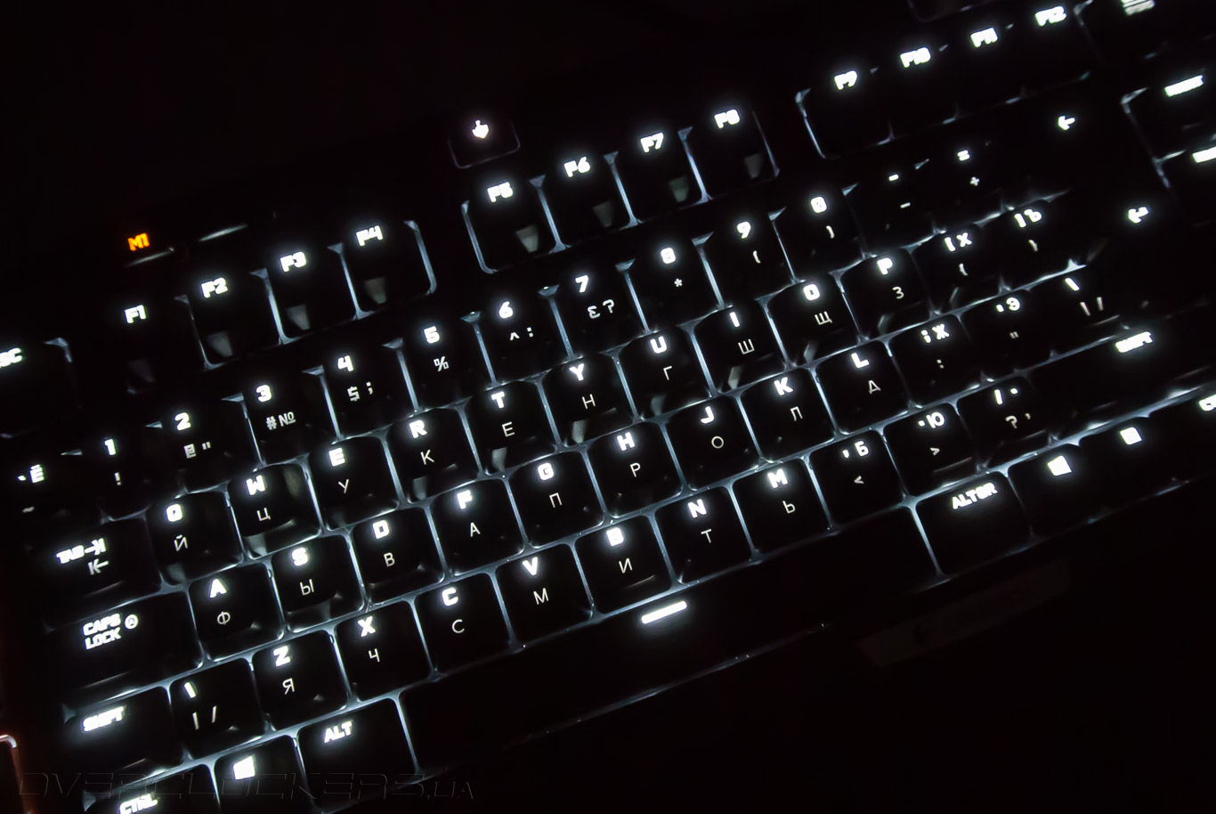 Все латинские символы подсвечиваются отчетливо. А вот качество гравировки кириллических символов наоборот оказалось очень плохим. Яркость подсветки кириллицы даже на максимальном уровне не дотягивает до видимости латинских символов при 25% освещении. В результате, кириллические символы совсем незаметны в темноте.