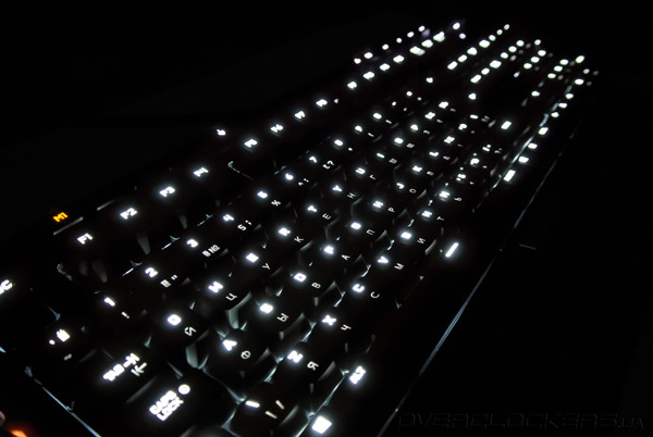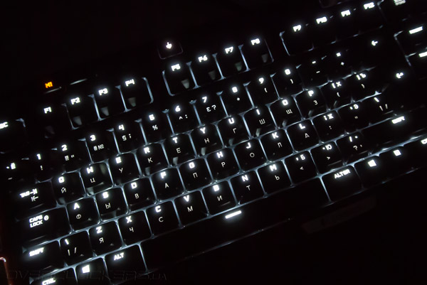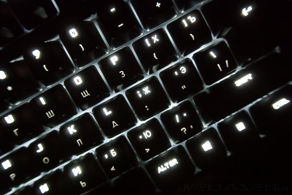 К недостаткам также можно отнести подсветку кириллических символов, которая реализована не самым лучшим образом. Сливающиеся в общей массе клавиши Х, Ъ, Ж, Э, Б, Ю существенно затрудняют набор текста, создавая для пользователя дополнительные неудобства. На максимальном уровне, иллюминация настолько яркая, что бросается в глаза. Для комфортной работы мы снизили яркость подсветки до среднего уровня.