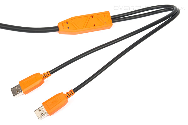 Устройство имеет проводной тип соединения. Подключение к ПК происходит посредством USB-порта. Кабель плотный, тканевой оплётки не имеет. Общая длина провода составляет два метра. На конце кабеля есть разветвление на два разъёма USB 2.0. Один предназначен для самой клавиатуры, а второй для подачи дополнительного питания подсветки.