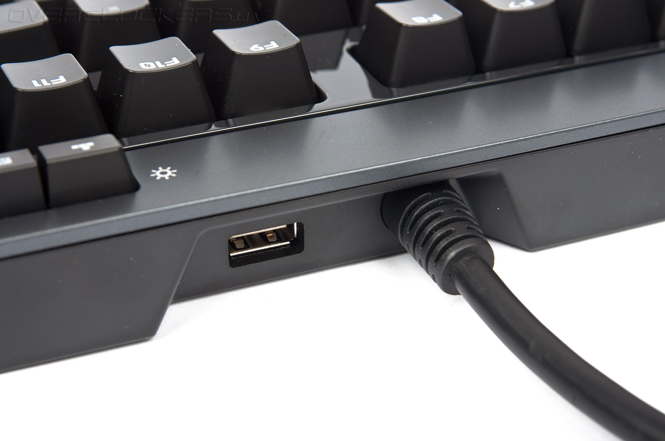 Рядом с местом подсоединения кабеля к корпусу находится один USB-порт. Он предназначен для подключения внешних устройств и накопителей. Месторасположение разъёма нам понравилось, так как подключенные USB кабеля никак не мешают в процессе работы.