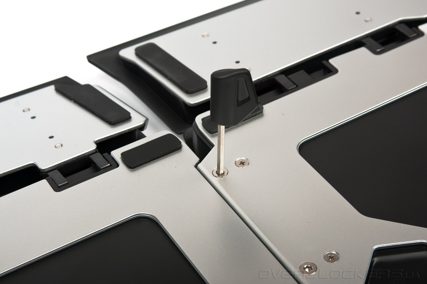 Для того чтобы соединить основной модуль клавиатуры с цифровым блоком, пользователю потребуется проделать лишь пару несложных манипуляций. Первым делом мы скрепляем обе части. Справа от основного блока находится специальный выступ, через который и происходит соединение. Плотно сдвинув обе части друг к другу, вы услышите звонкий щелчок, после чего можно приступать к фиксации модулей двумя шестигранными винтами. Винты закручиваются миниатюрной отверткой, включенной в комплект поставки.
