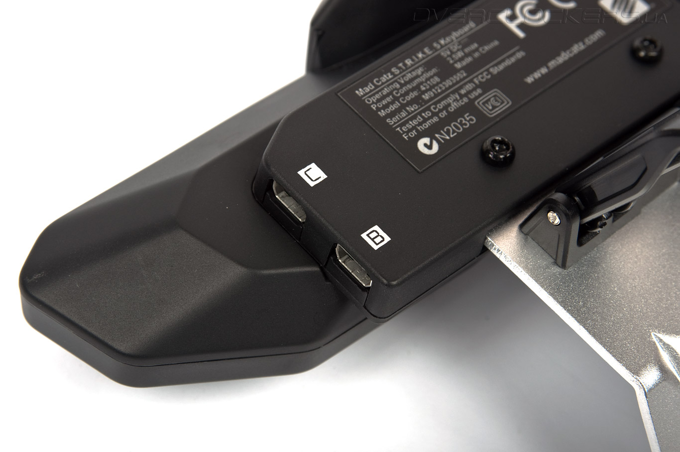 Cлева расположен разъём для подключения съёмного блока макро-клавиш М1–М4 (А), справа находится порт для соединения кабеля, выходящего от цифрового блока (В, С).
