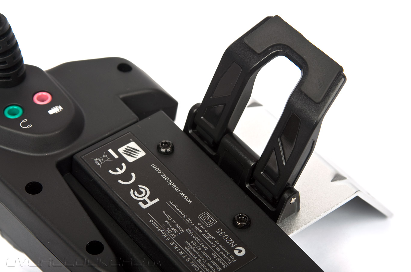 Рядом с аудиопортами находится раздвижная ножка, фиксирующая положение модуля на рабочей поверхности. Таким образом, модуль E.Y.E. легко размещается на небольшом расстоянии от самой клавиатуры.