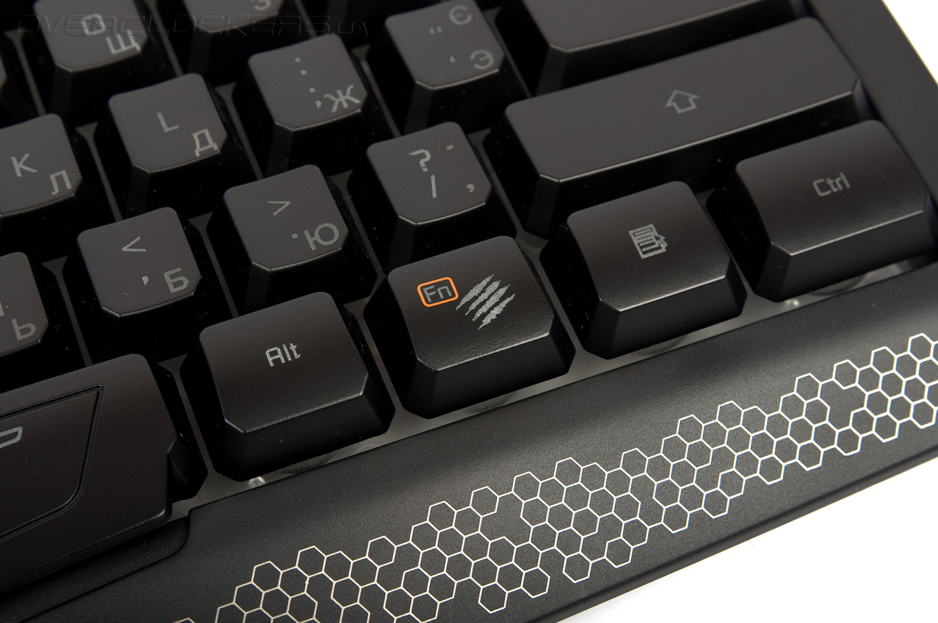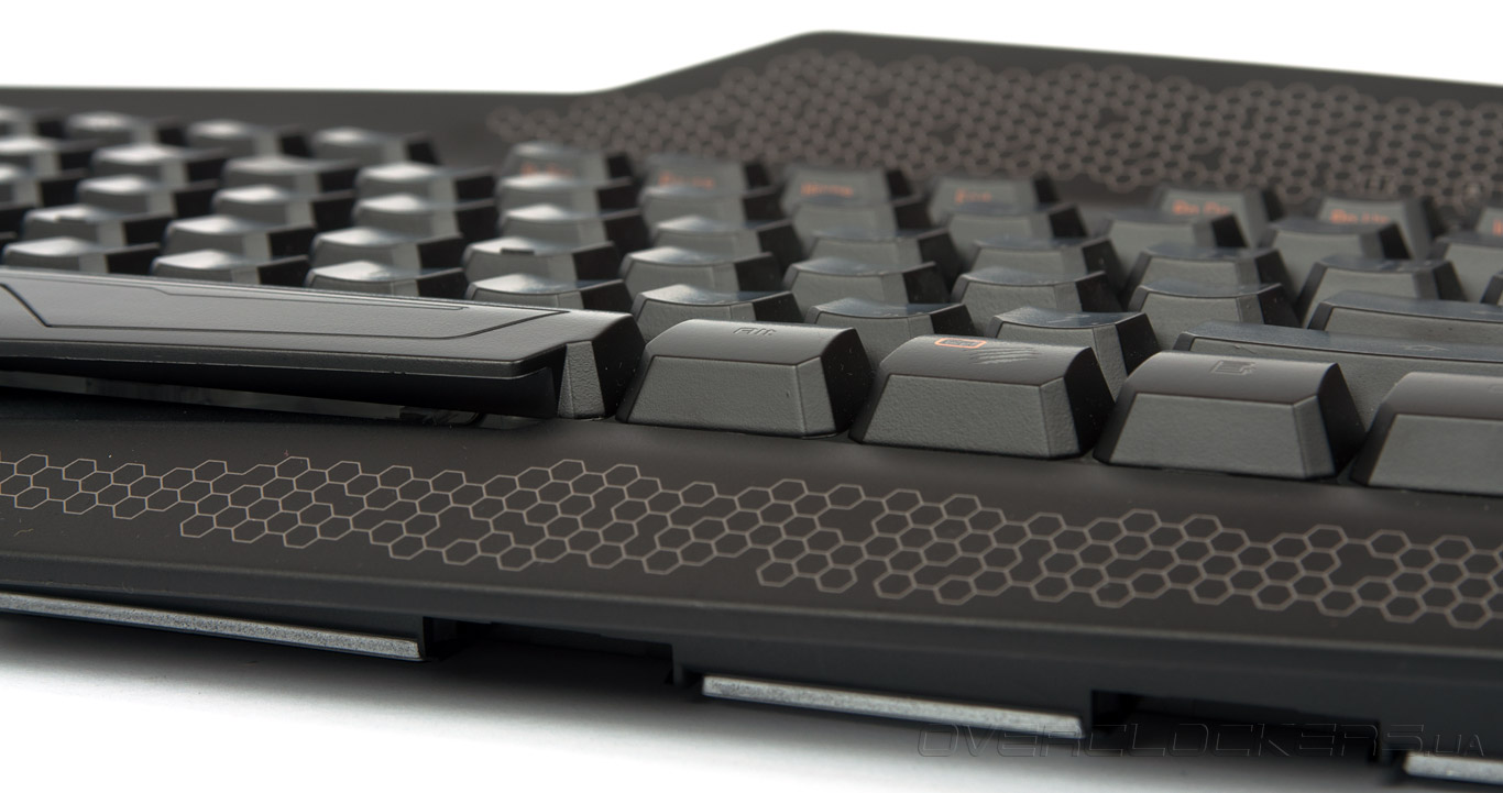 Длинный Shift и одноуровневая клавиша Enter находятся на своих привычных местах. Одним из немногих изменений в раскладке стала замена правого Win функциональным элементом Fn. Фирменный логотип компании Mad Catz украшает рабочую поверхность кнопки Fn, заметить его на фоне основного блока не составит труда.