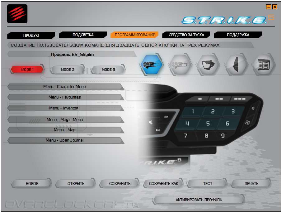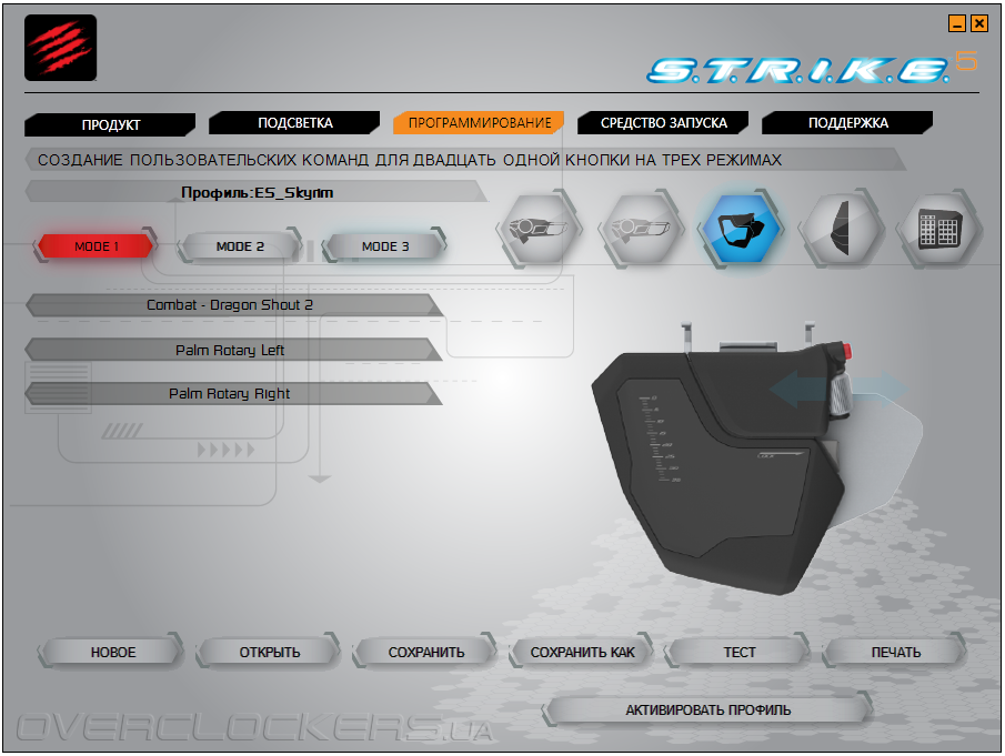 В играх устройство также зарекомендовало себя с наилучшей стороны. Впрочем, это было весьма ожидаемо. Наличие множества дополнительных клавиш значительно упростило игровой процесс. Тестирование проходило в играх различных жанров: The Elder Scrolls V: Skyrim, Battlefield 3, Far Cry 3, Crysis 3, Diablo III, League of Legends и др. С сайта производителя мы предварительно загрузили подборку уже заготовленных пресетов под наиболее популярные игры: StarСraft 2, The Elder Scrolls V: Skyrim, SWTOR, WOW, XCOM, Guild Wars 2, Dishonored, Diablo III, Borderlands 2 и т.д. Готовые профили хорошо проработаны. На программируемые элементы 1–9 контрольного модуля E.Y.E. подвязаны самые часто используемые действия игрового персонажа. Макро-кнопки М1–М4 в большинстве готовых игровых профилей не задействованы, поэтому действия к ним стоит подвязывать самостоятельно.