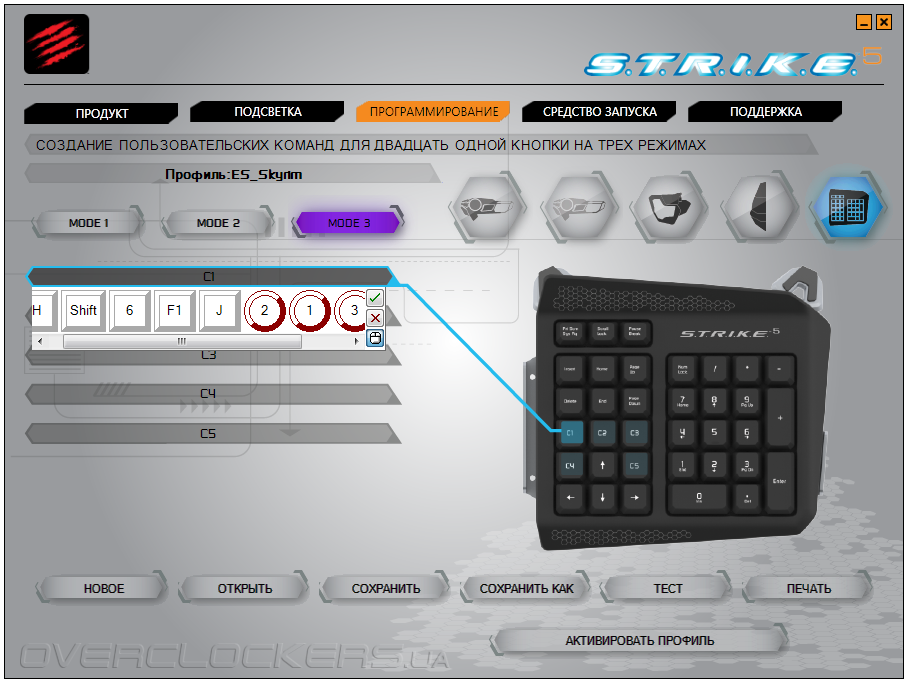 Над программируемыми кнопками 1–9 разместились три клавиши переключения профилей. Всего геймеру даётся в распоряжение три отдельных профиля. Для активации конкретного пресета необходимо нажать на соответствующий элемент. Создание и редактирование профилей также происходит через фирменное ПО Cyborg ST.