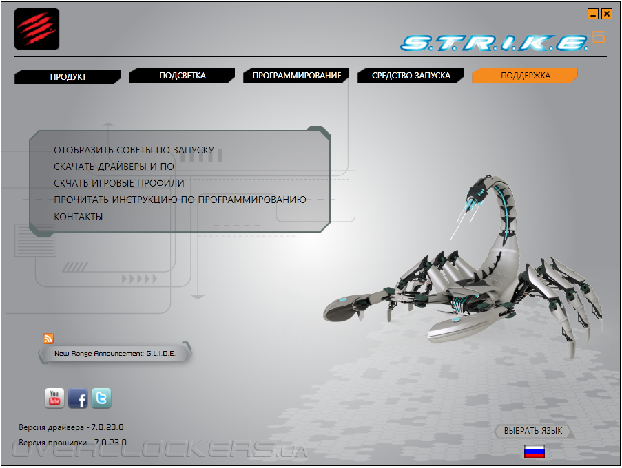 Главное меню включает в себя пять основных разделов: «Продукт», «Подсветка», «Программирование», «Средство запуска» и «Поддержка». Первая вкладка «Продукт» является исключительно информативной и конкретной пользы в процесс настройки не привносит.