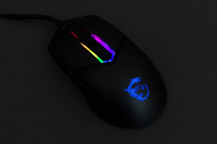 На корме находится подсвечиваемый логотип MSI в виде дракона. При переключении чувствительности он быстро моргает пять раз определенным цветом (синим, фиолетовым, красным, желтым и зеленым,), обозначая текущий уровень разрешения.