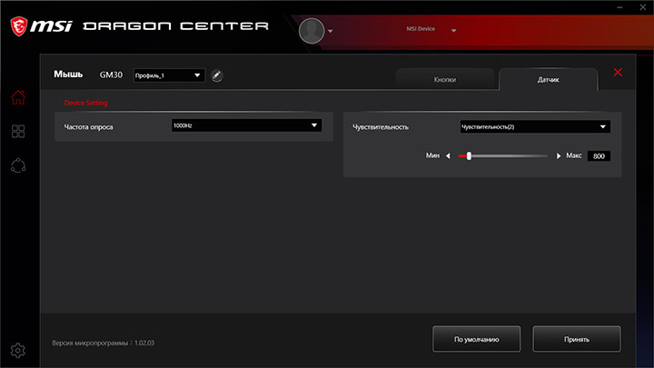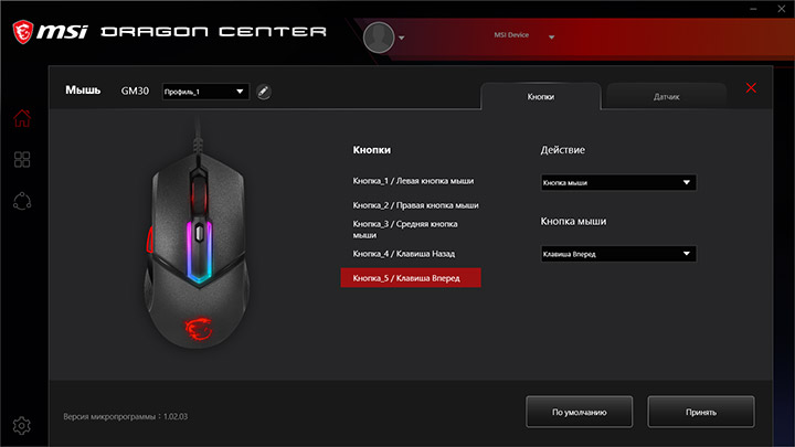 Чтобы попасть в настройки мыши, вверху нужно найти вкладку MSI Device. Текущая версия прошивки устройства определилась как 1.02.03. Настройки можно сохранять в три профиля, которым можно присвоить имя. В разделе «Кнопки» доступно переназначение пяти клавиш. Направления колеса прокрутки и переключатель разрешения смене команд не подлежат. Кнопкам можно присвоить действие по умолчанию, отключить полностью, привязать любое из пяти доступных команд мыши, назначить одну из семи мультимедиа команд или команд управления звуком или связать с ней макрос.