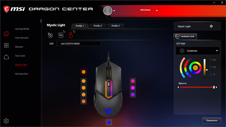 Настройка подсветки производится посредством компонента Mystic Light. Отдельно регулируется цвет колеса прокрутки, логотипа и семи светодиодов в центральной части верхней панели. Есть возможность настроить любые цвета, отрегулировать яркость, скорость и направление восьми эффектов, или раздельно назначить цвет каждому светодиоду. Все изменения сохранятся в памяти мыши.