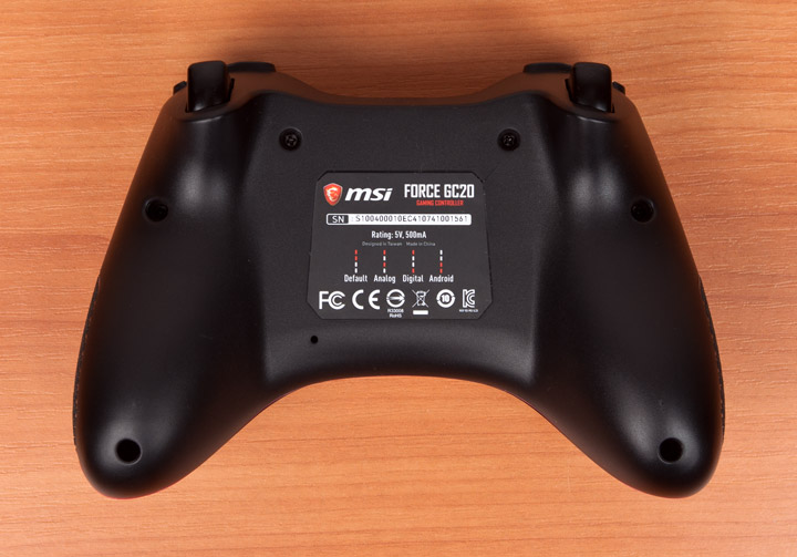 На задней части контроллера находится стандартная наклейка с нужной информацией, номером модели и прочими данными. По центру есть подсказка по переключению четырех режимов джойстика.