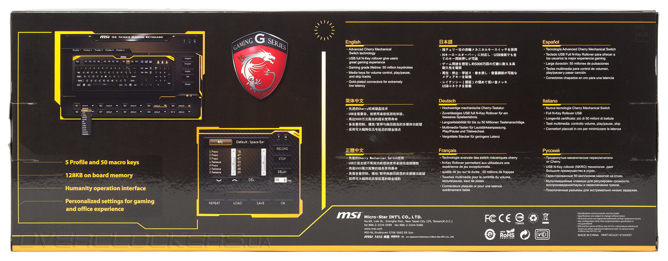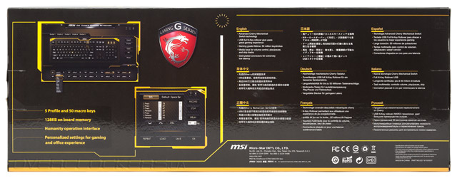На лицевой стороне имеется название модели, логотип MSI Gaming G-Series и указан тип используемых переключателей Cherry. В нижнем правом углу расположено небольшое окошко, позволяющее даже в закрытом виде протестировать работу механических клавиш.