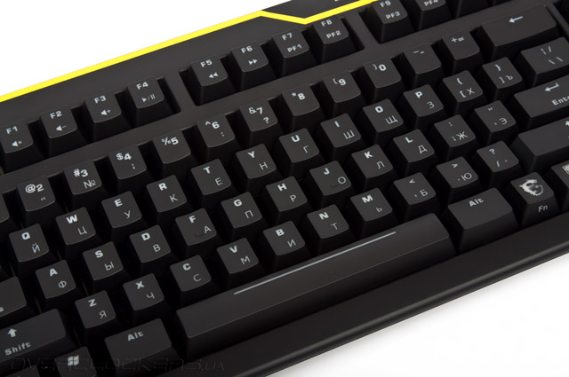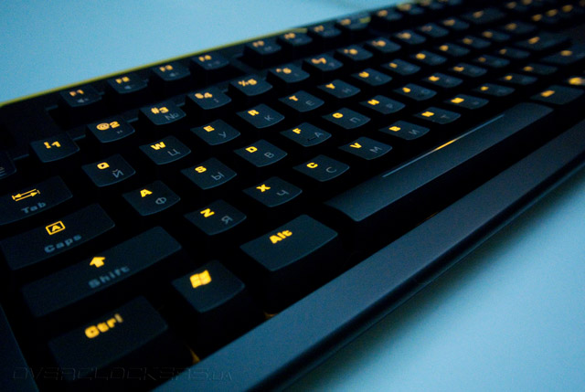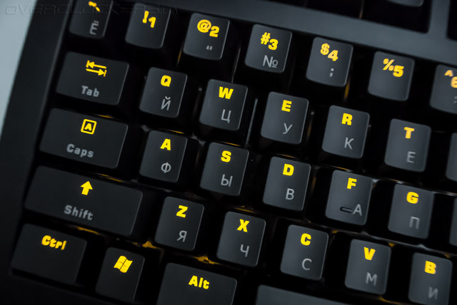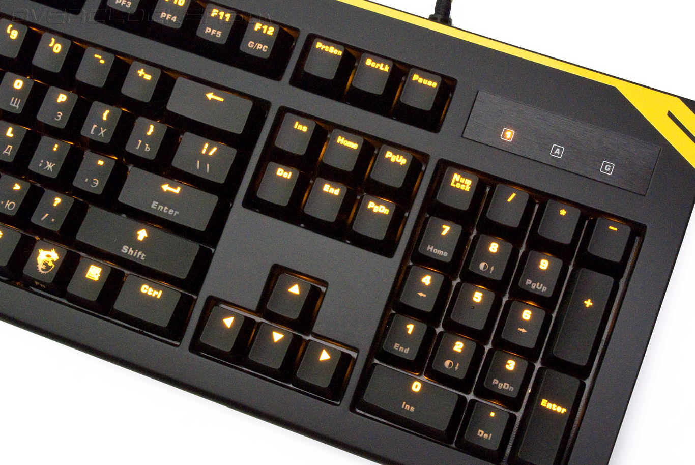 Подсветка сосредоточена во всех зонах, в том числе и на клавише пробела. Под каждой кнопкой размещен отдельный диод, светящийся только желтым цветом.