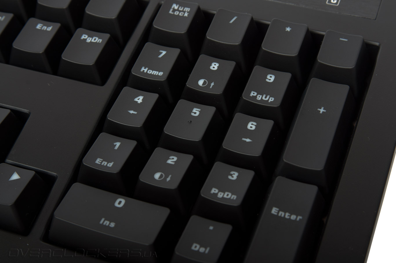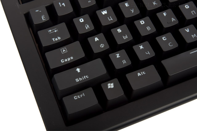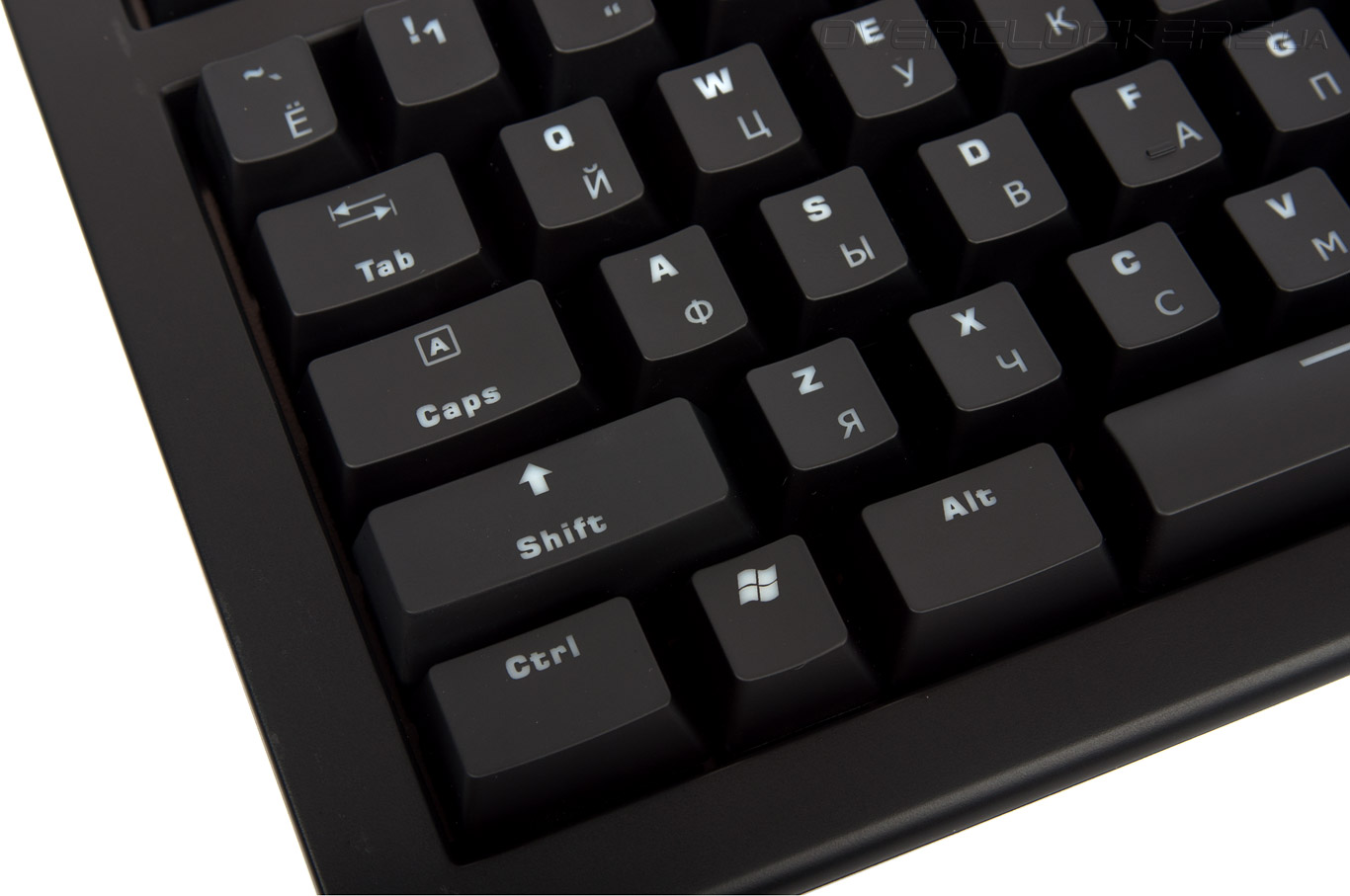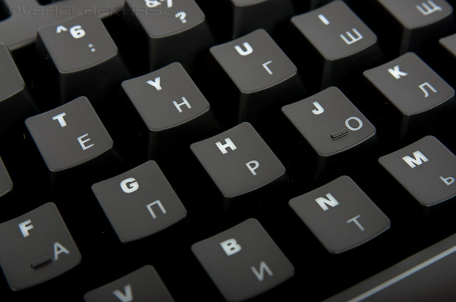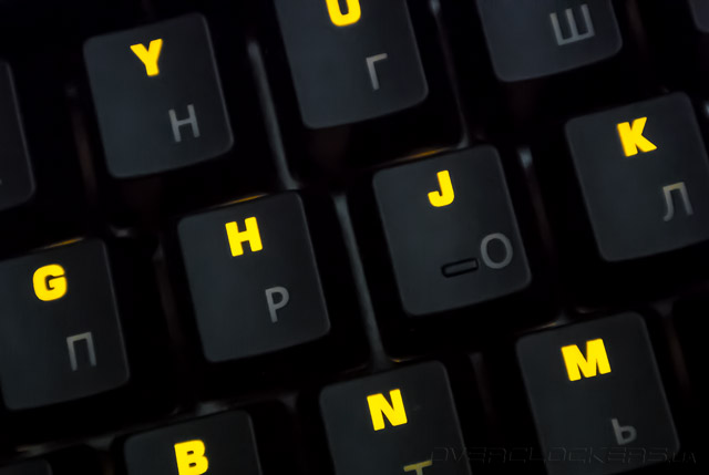 Латинские символы подсвечиваются ярко и отчётливо видны на расстоянии. Несмотря на наличие точечной подсветки, кириллица практически незаметна в темноте и это непосредственно сказывается на удобстве набора. Даже выставив максимальный уровень яркости, нам не удалось добиться корректного отображения кириллических символов.