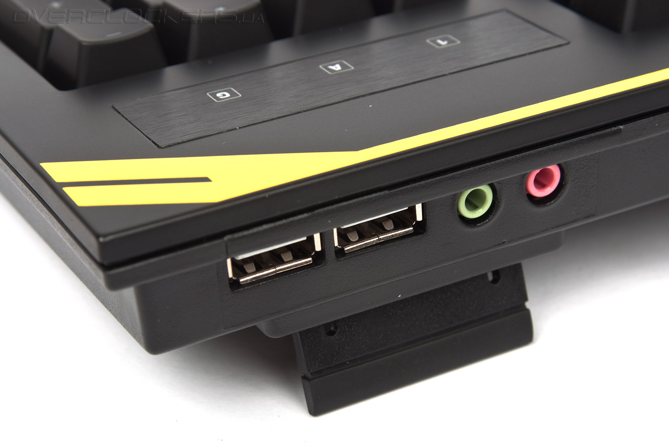 Устройство оснащено встроенным USB-хабом. Для поклонников сетевых игр, требующих слаженной координации действий команды, по соседству с портами USB 2.0 есть пара гнезд под штекер 3,5 мм с двумя аудио разъёмами: первый для подключения наушников и второй под микрофон. Возможность быстрого подключения гарнитуры будет востребовано у геймеров, которые устали постоянно тянуть нужные провода к системному блоку.