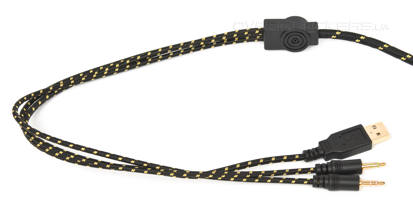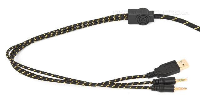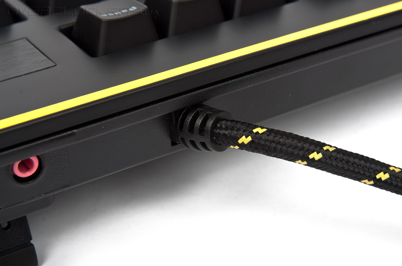 Конец основного кабеля разветвлён на два 3,5-мм штекера для подключения к аудиовыходам звуковой карты и один коннектор USB 2.0. Примечательно, что питание клавиатуры и подсветки осуществляется посредством одного канала, а не двух, как мы привыкли видеть ранее. Возможно, из-за отсутствия отдельно выделенного питания, яркость подсветки находится на среднем уровне.