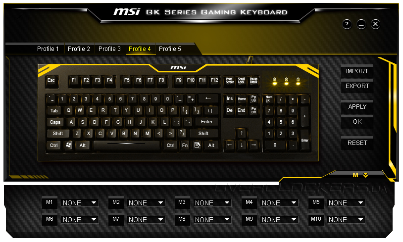 Установочный файл находится на отдельном диске, входящий в комплект поставки. Процесс установки длится считанные минуты. Программное обеспечение имеет обобщённое название — MSI GK Series Gaming Keyboard Config. ПО к сожалению не русифицирован. Тем не менее, значения надписей вряд ли смогут ввести пользователей в заблуждение. Интерфейс программы представлен в виде единственного окна, в котором показано графическое изображение клавиатуры с кнопками записей макросов и создания профилей.