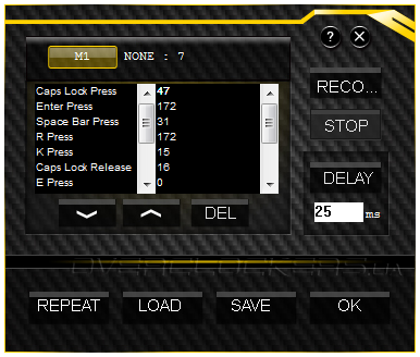 Снизу находятся 10 кнопок записи макросов. Пользователь может свободно перепрограммировать клавиши, используя стандартные команды редактирования, такие как: вырезать, вставить, выделить всё, копировать, найти, сохранить и т.д. Самой интересной функцией из предложенного перечня, конечно же, является макро-команда. Процесс создания макроса очень прост и с первого раза будет понятен даже новичкам. Запись происходит в следующем порядке. Пользователь выбирает любую из десяти макро-кнопок (М1–М10). Контур кнопки начинает мигать, информируя о готовности элемента к проведению дальнейших манипуляций. Из предложенного списка выбирается функция — MACRO. В появившемся окне необходимо нажать на начало записи и воспроизвести нужную комбинацию. После сохранения на раскладке активируется та кнопка, которой планируется присвоить макрос.