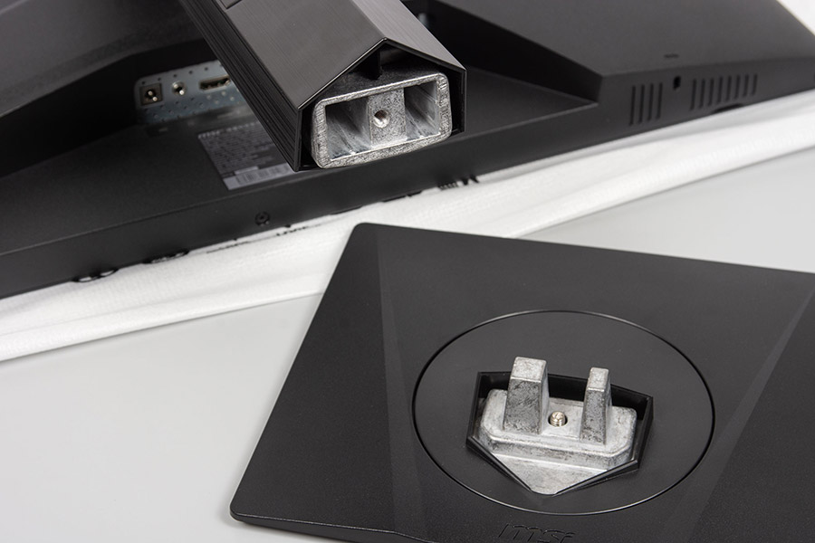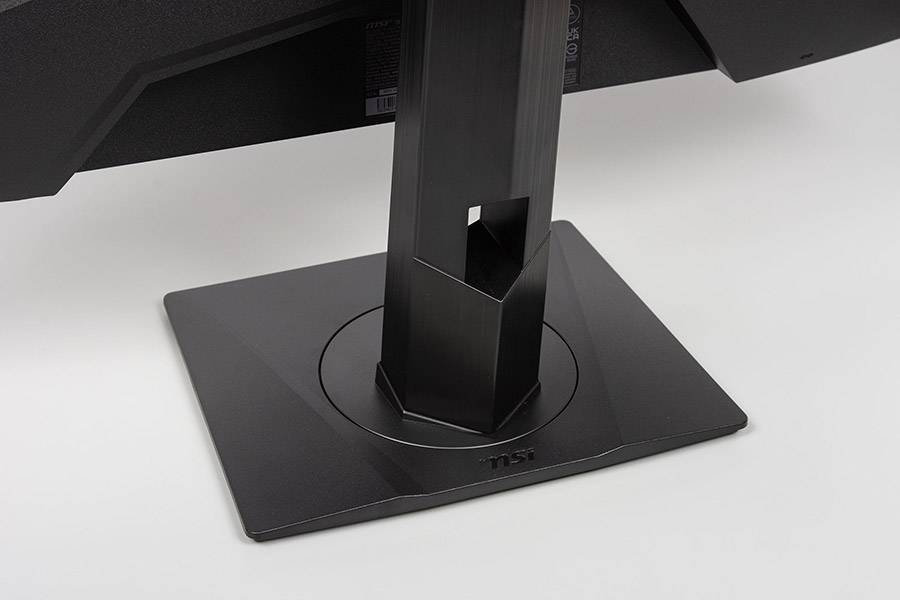 Стойка металлическая с пластиковой накладкой, пятиугольником в профиль — такую же самую ножку можно увидеть у модели G274QPF-QD, которая была год назад на тестировании. Собирается она довольно просто, а если в ней нет необходимости, то можно использовать крепление для кронштейна VESA75. Для прокладки кабелей ножка имеет отверстие у основания.