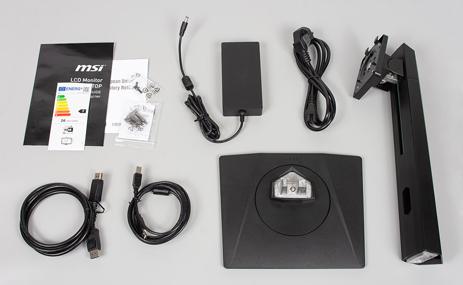 В комплекте поставки присутствует документация, набор креплений для кронштейна VESA75, разобранная стойка, кабели USB, DisplayPort и сетевой, а также блок питания.
