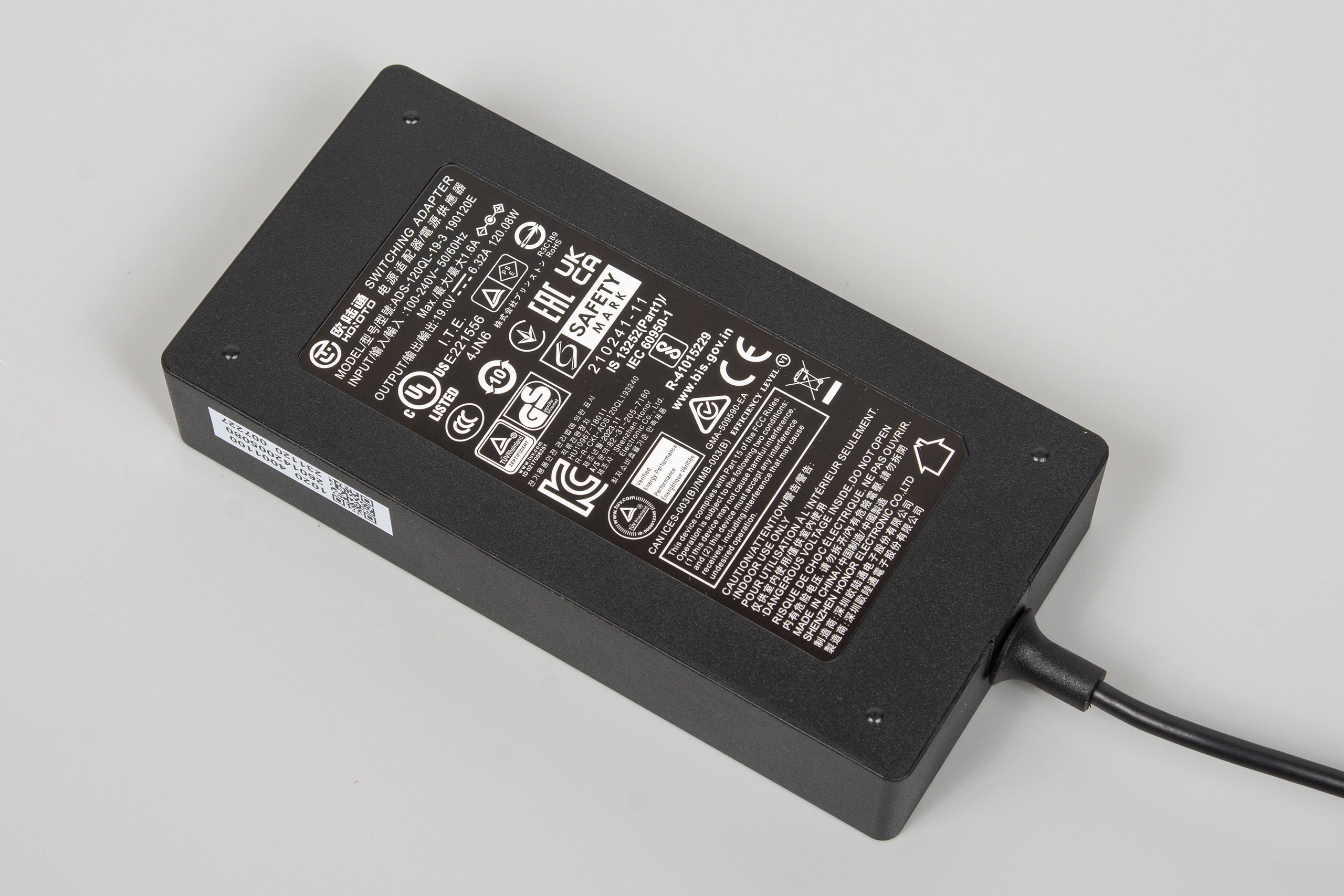 Блок питания имеет на выходе 19 В и обеспечивает нагрузку мощностью до 120 Вт. Сетевой разъем здесь ноутбучный «микки-маус», так что для подключения к источнику бесперебойного питания придется использовать переходник.