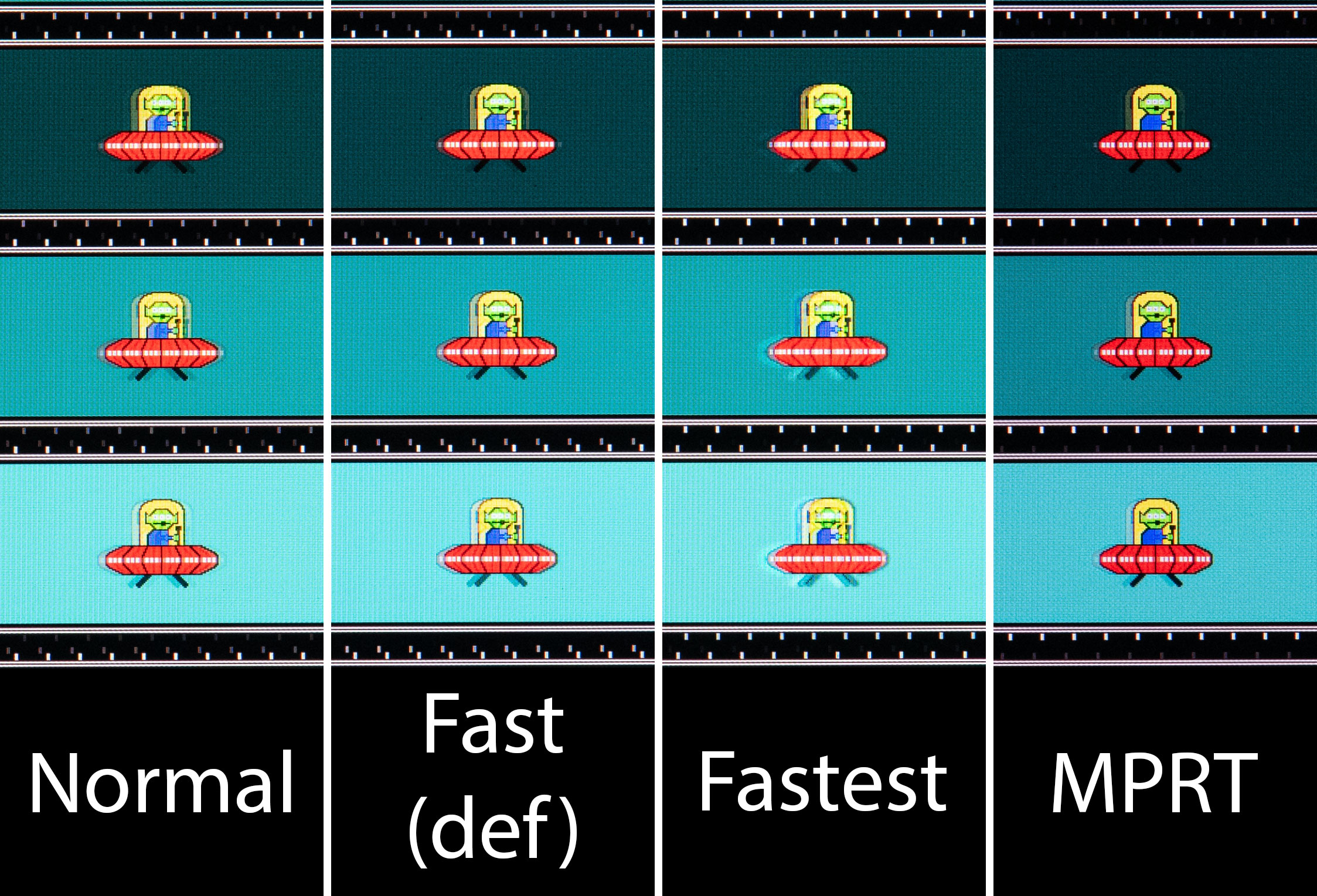 В настройках есть несколько режимов разгона матрицы, при фабричных настройках установлен Fast, который можно не трогать, так как для Normal характерен визуальный мягкий шлейф за объектами, а Fastest добавляет неприятные артефакты в движении. Режим MPRT улучшает четкость изображения, но влияет на яркость.