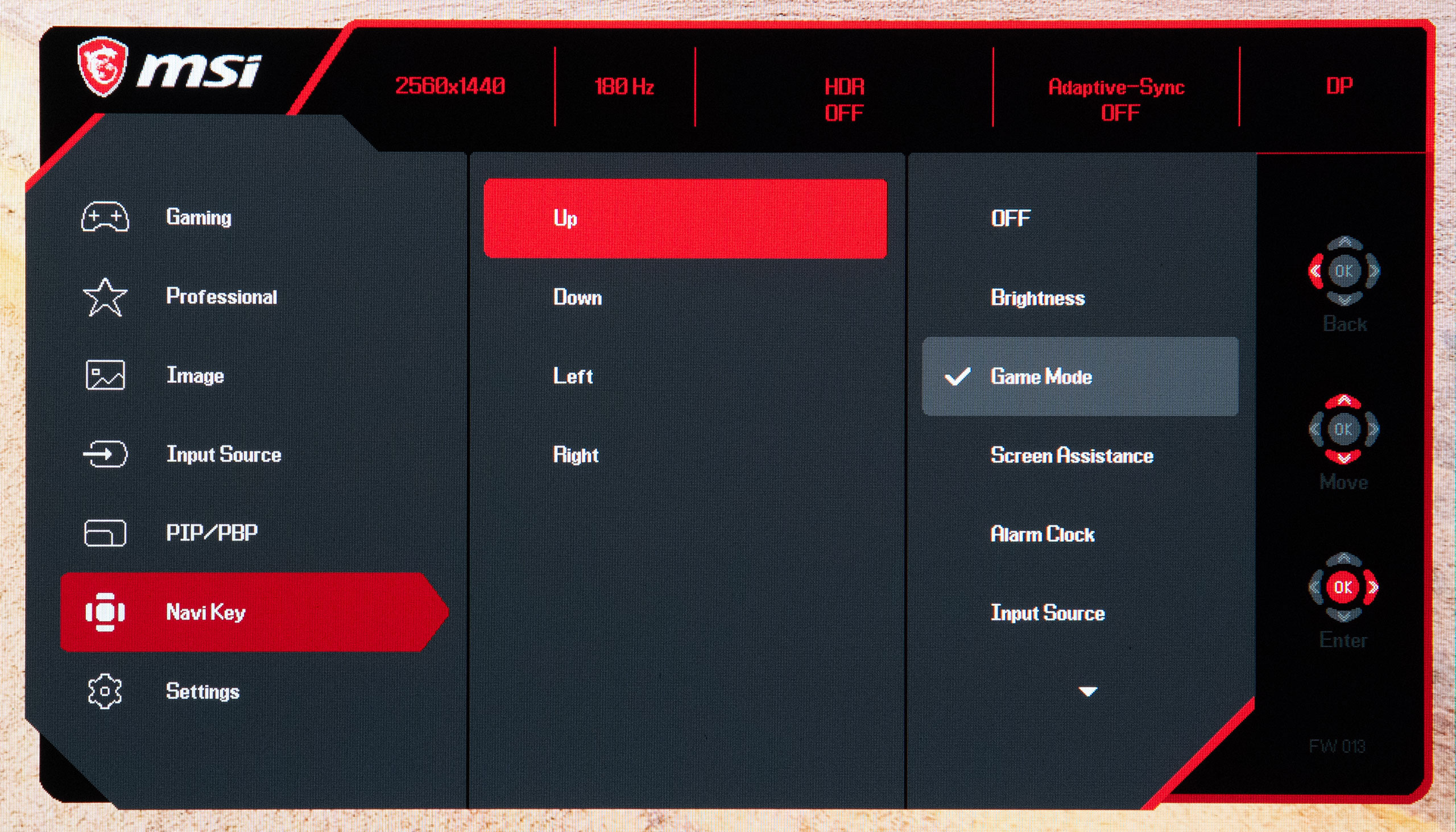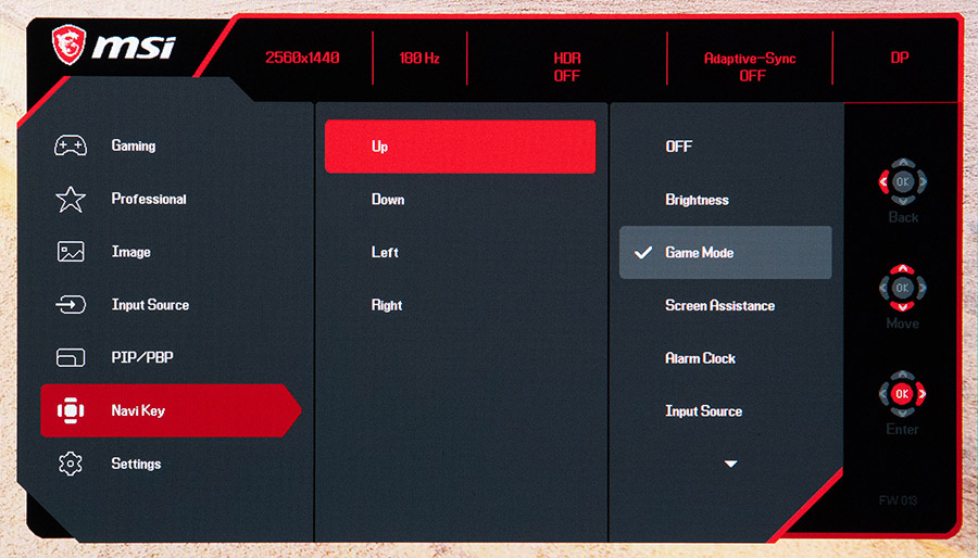 Управление монитором осуществляется через пятипозиционный джойстик, расположенный справа на задней части устройства. Меню стандартное для мониторов MSI. Вверху расположена информация о разрешении, частоте обновления, режиме HDR, статусе Adaptive-Sync и порте подключения. Изначально доступно меню Gaming, где можно выбрать один из игровых режимов FPS, Racing, RTS и RPG, или пользовательский режим с «премиальными цветами». Есть настройки экрана для темных сцен, активация и размещение счетчика количества кадров в секунду, таймера и включение технологии Adaptive-Sync и MPRT. Там же находится управление функцией KVM.