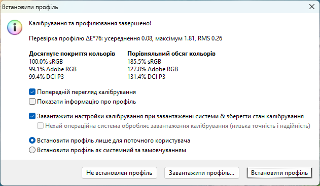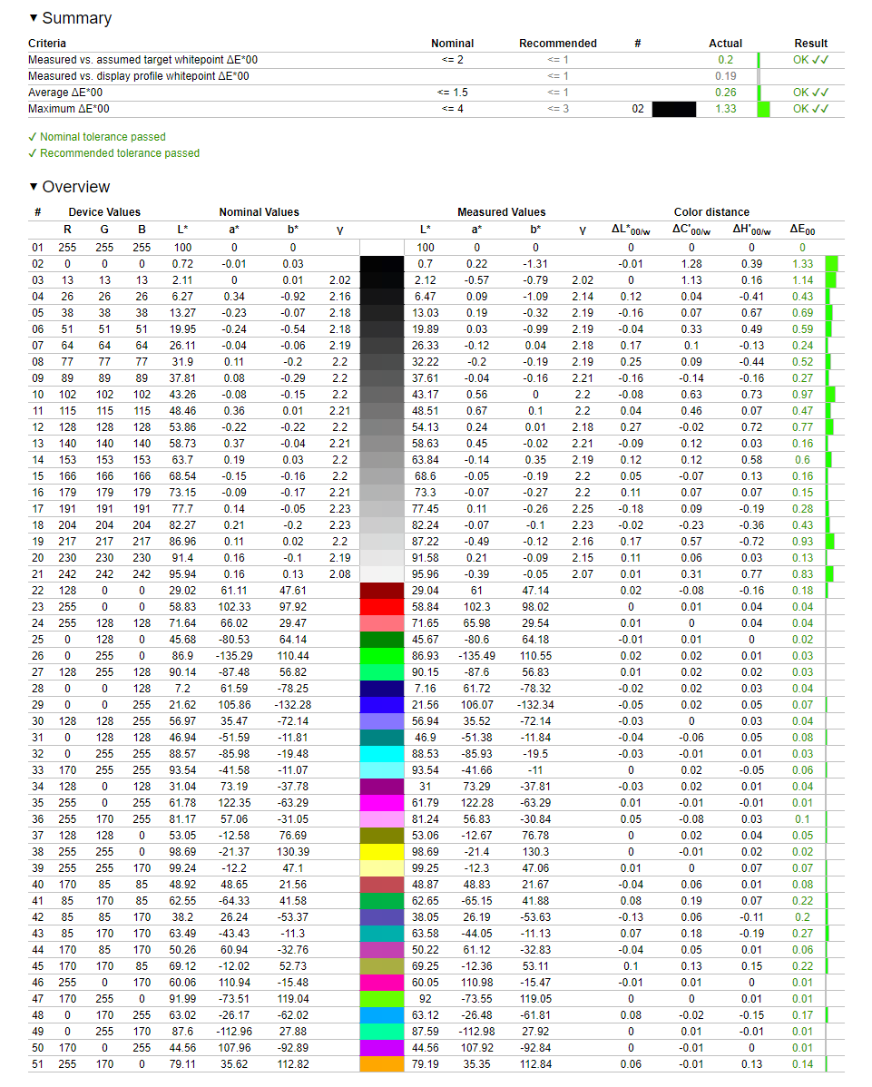 Калибровка получилась хорошей, средняя DeltaE менее 1, проблем с точкой белого нет.