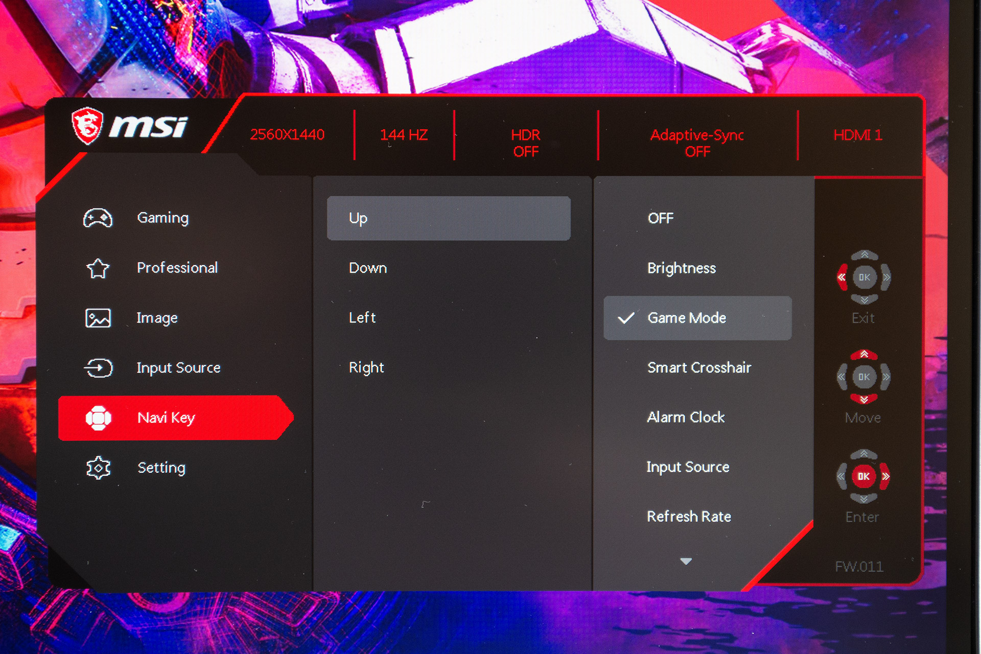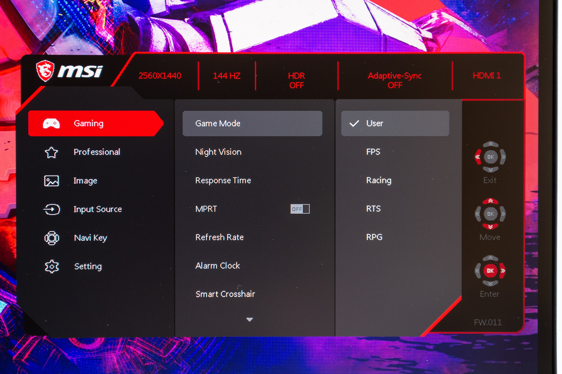 При нажатии на джойстик пользователь попадает в экранное меню настроек. Сверху в нем отображена сразу вся полезная информация о текущем разрешении, частоте обновления, режиме HDR, статусе Adaptive-Sync и порте подключения. В меню игровых режимов на выбор есть пользовательский режим и фабричные режимы для игр в жанре FPS, Racing, RTS и RPG.
