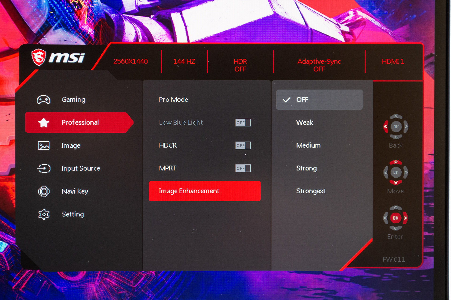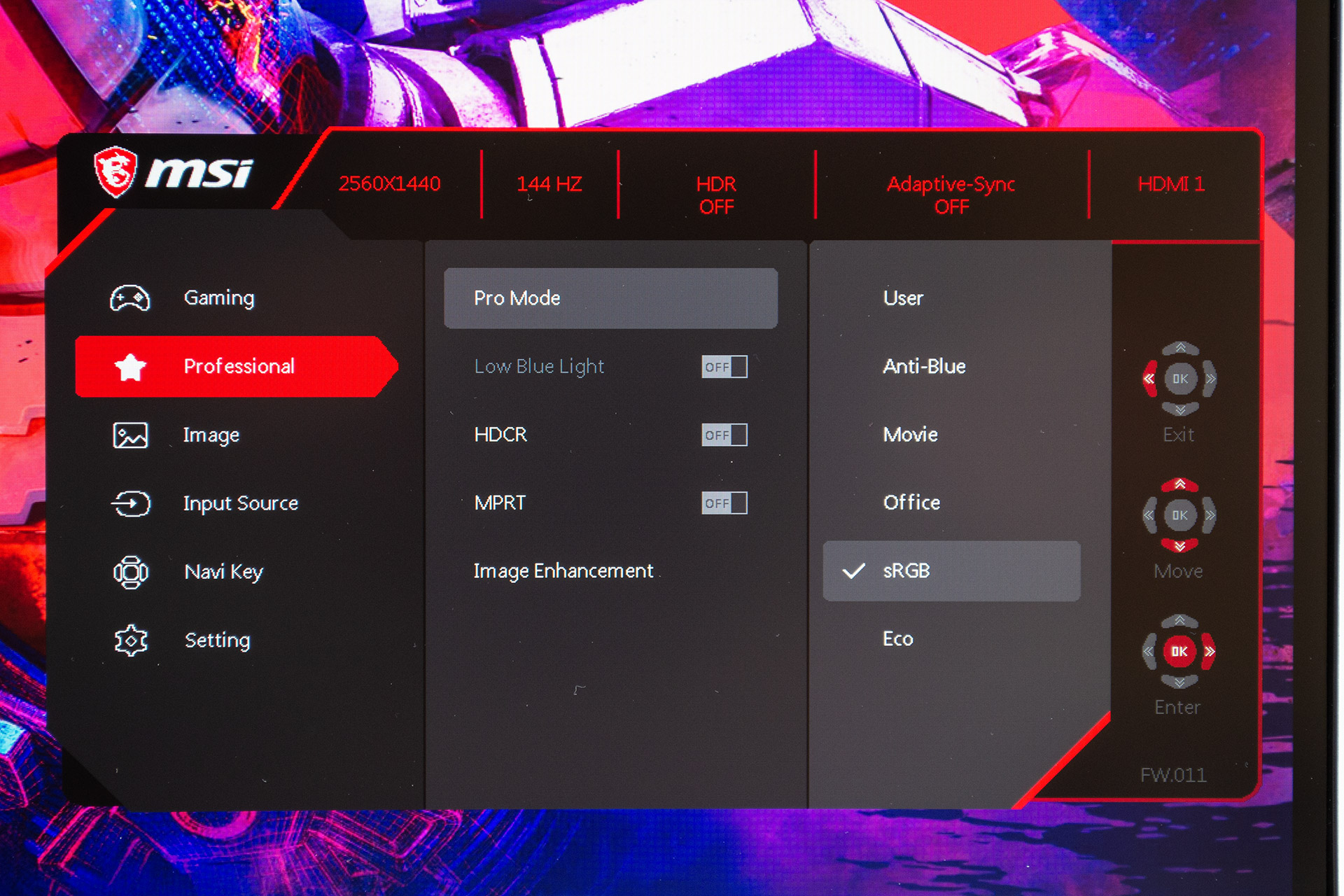 Во втором «профессиональном» пункте меню скрываются дополнительные фабричные режимы настройки картинки для уменьшения вредного голубого света, просмотра фильмов, офисной работы, дизайнерской работы с цветом (sRGB). А еще режим экономии энергии, включенный по умолчанию. Здесь также имеются переключатели Low Blue Light, HDCR (динамическая контрастность) и дублируется MPRT.