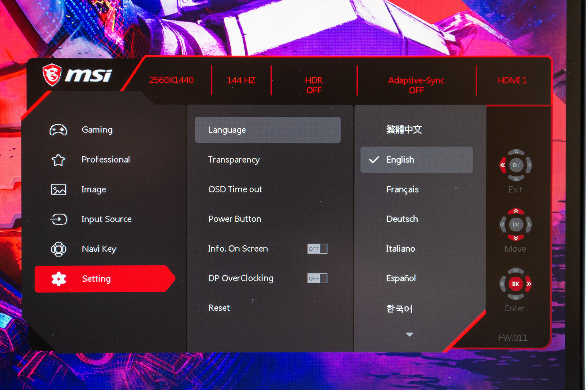 Последняя вкладка отвечает за настройку меню монитора. Здесь можно выбрать язык интерфейса OSD.