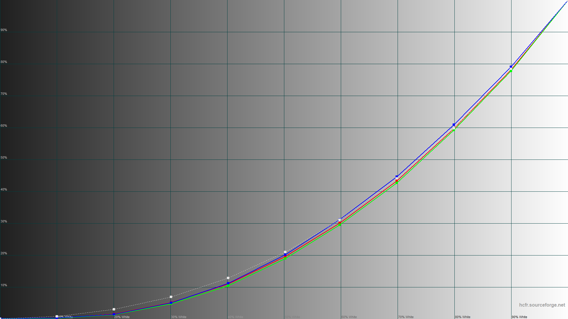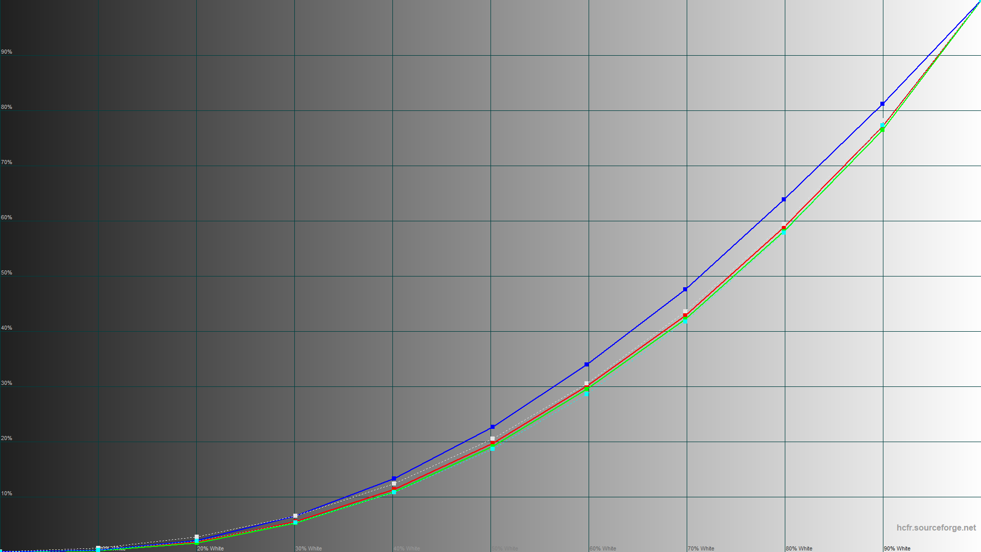 По гамма-кривым видим, что синий цвет сильно выше референтных значений, а красный и зеленый наоборот очень близки.