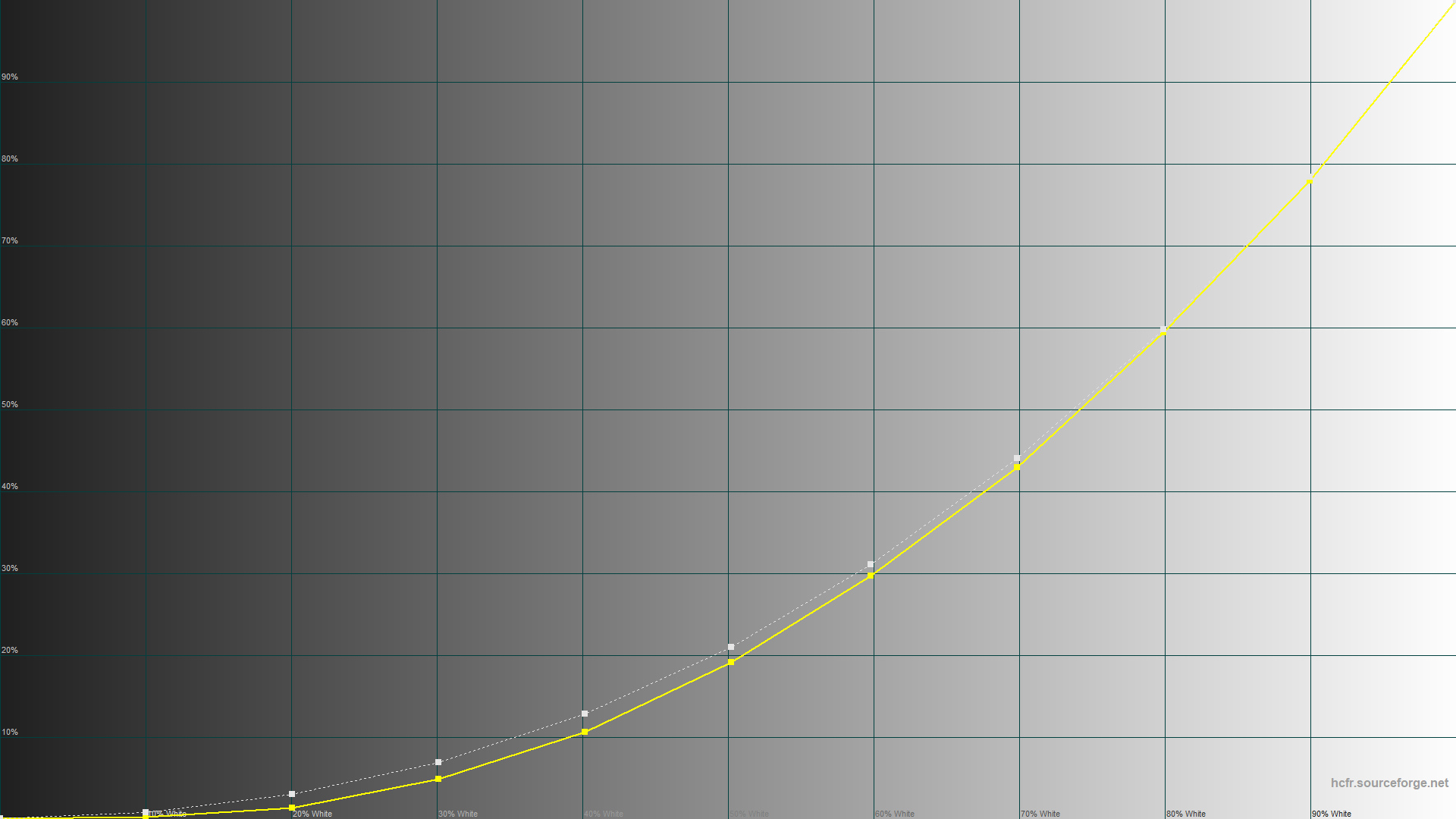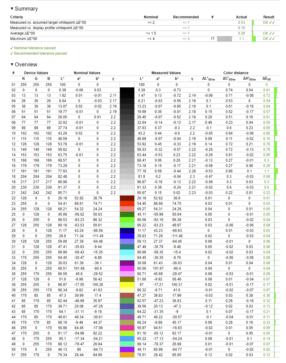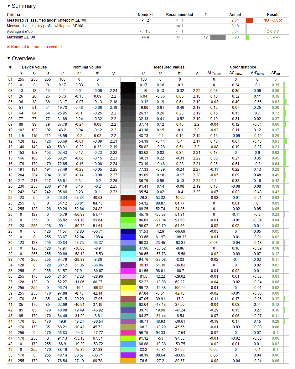Дисплей достаточно точно воспроизводит все цвета. По современному стандарту ΔE*00 не только среднее, но и максимальное значение отклонения меньше единицы. Пара существенных проблем здесь это отклонение точки белого от номинала и нестабильность цветовой температуры. Посмотрим, что с этим можно сделать.