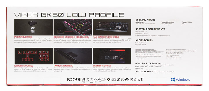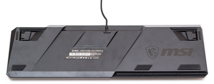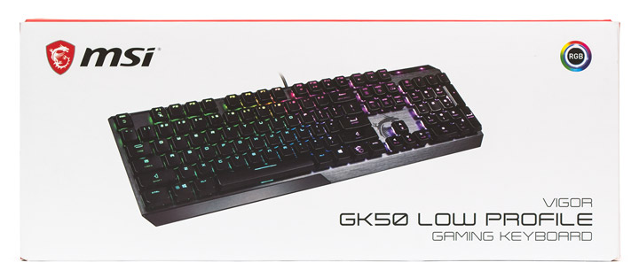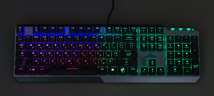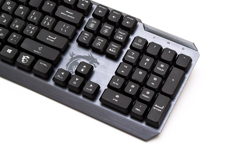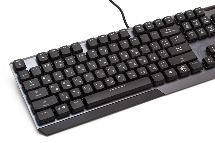 Раскладка низкопрофильных клавиш выполнена по стандарту ANSI с длинными однорядными Shift и Enter. Кнопка F1 расположена над цифрой «2». Символы нанесены методом лазерной гравировки, путем выжигания в краске. Латиница средней толщины смещена в левый верхний угол колпачков, а более тонкая кириллица — в правый нижний. Все буквы отлично читаются как с подсветкой, так и без неё. Зазор между колпачками клавиш маленький, как на клавиатурах ноутбуков. Верхний ряд функциональных кнопок находится почти вплотную к основным текстовым клавишам. Сами колпачки кнопок практически плоские в профиль, со срезанными под восьмиугольник углами. Кнопка Fn, отмеченная в данном случае логотипом MSI в виде дракона, занимает позицию кнопки вызова меню справа.