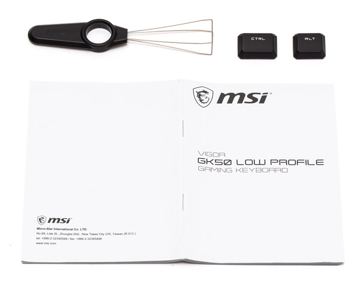 В комплекте поставки есть инструкция, ключ для демонтажа колпачков клавиш, и два округлых дополнительных колпачка для кнопок Alt и Ctrl.
