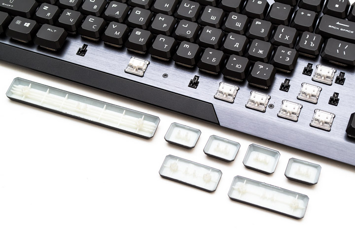 Колпачки клавиш изготовлены из окрашенного с внешней стороны ABS-пластика. Крепления у них в виде двух защелок и с обычными крестовыми колпачками от Cherry они никак не совместимы. Отдельно отмечу великолепную стабилизацию длинных кнопок. Если пробел еще слегка пошатывается при нажатии, то все остальные клавиши четко выдерживают горизонталь. Проволочные тяги скрытого типа позволяют без проблем снимать колпачки для очистки, тем более что в комплекте для этого есть приличный ключ.