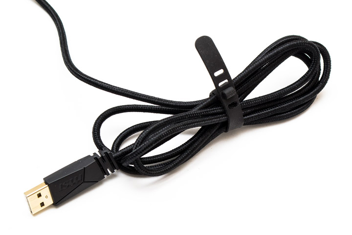 Провод в нейлоновой оплетке средний по гибкости и хорошо запоминает заданную форму. Его измеренная длина составляет 1,7 метра (хотя производитель заявляет 1,8). Ферритового кольца на шнуре нет, но есть удобная резиновая стяжка для сматывания лишней длины кабеля.