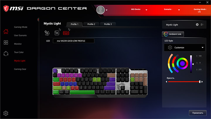 MSI Vigor GK50 частично использует драйвер MSI Dragon Center (актуальная версия на момент написания обзора — 2.0.30.0), который требуется загрузить с официального сайта и установить. Фактически, это полновесный комплекс для материнских плат компании, и, если вам только не требуется тонко настраивать подсветку клавиш или записывать макросы, устанавливать Dragon Center не имеет смысла.