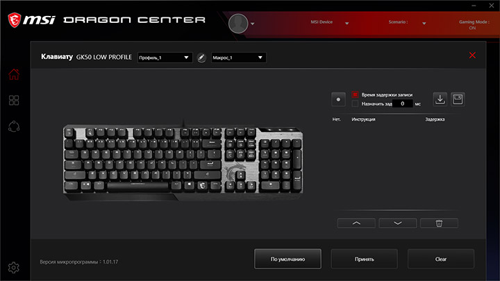 В Gaming gear можно выбрать свою клавиатуру среди других устройств, записать и назначить на любую из кнопок кроме Fn до 30 индивидуальных макрокоманд. Для записи доступно три профиля. Регистрируются только нажатия клавиатурных клавиш, с учетом задержек или без них.
