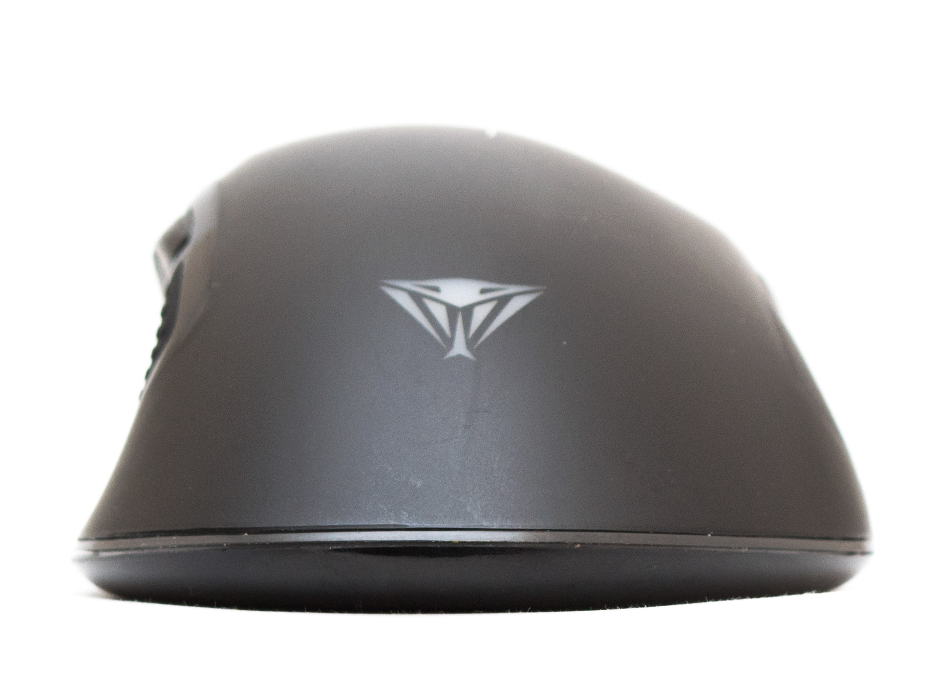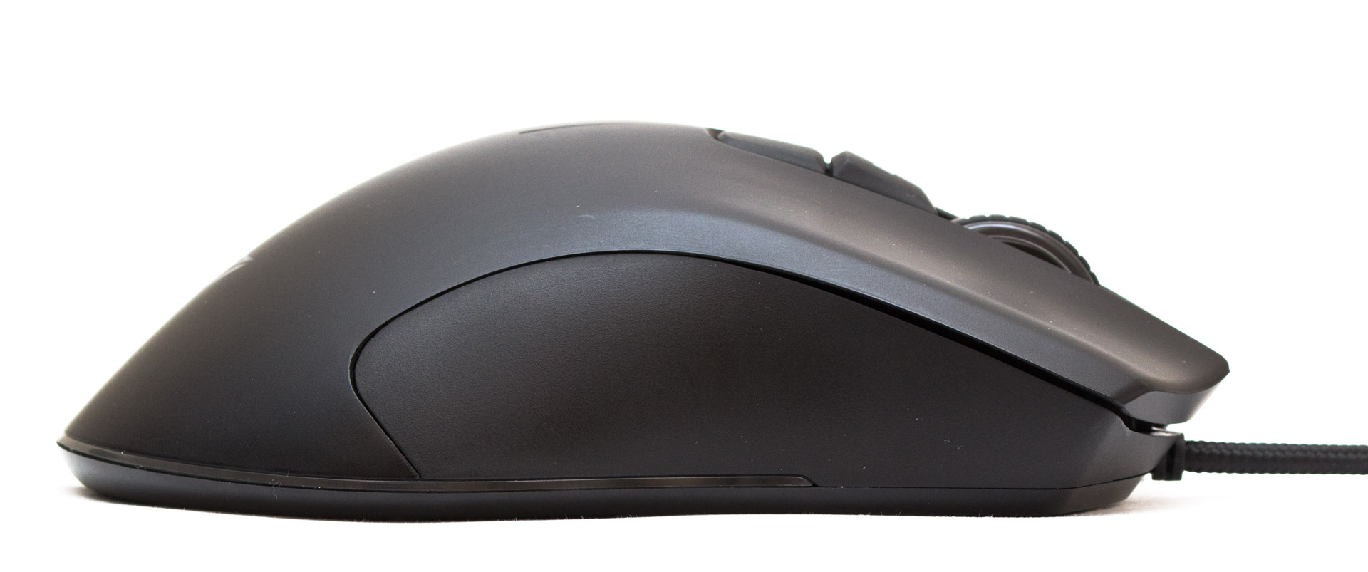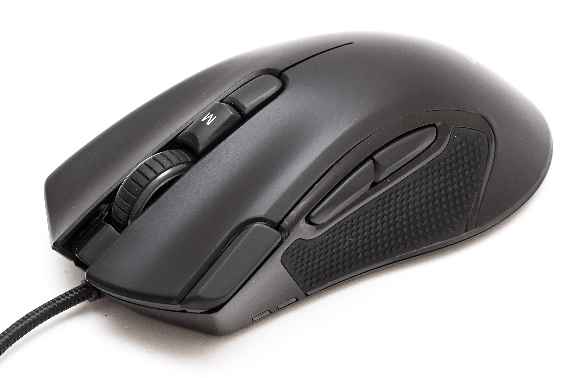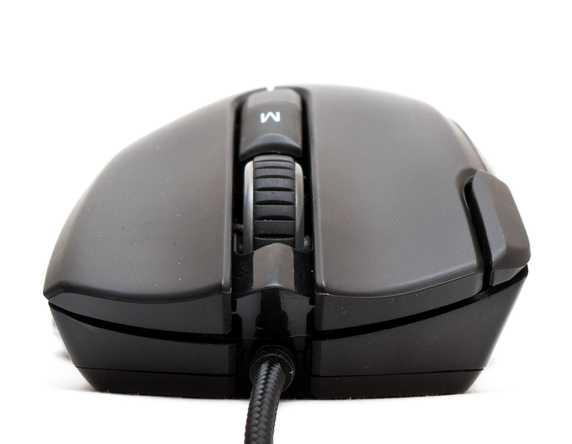 При взгляде на мышь спереди становится понятна избыточная жесткость панелей основных кнопок. Тут у них есть массивные ребра, занимающие половину передка. Сигнальный кабель заходит в корпус ровно посередине, на небольшой, но достаточной высоте, чтобы не задевать поверхность при активных перемещениях. В месте контакта есть короткая защита от перегиба шнура. Колесо прокрутки прорезинено, имеет горизонтальные тактильные углубления. Энкодер вращается практически бесшумно, без люфта и со слабо ощутимыми позициями фиксации.