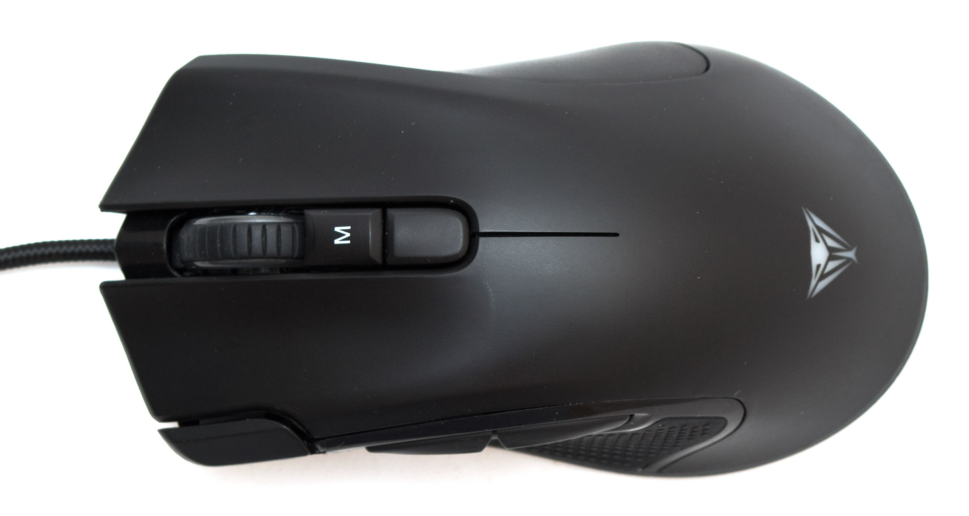 Patriot Viper V551 обладает эргономичной и ассиметричной формой корпуса. Она довольно самобытная и не повторяет обводов известных мне моделей других производителей, хотя на первый взгляд и кажется похожей на DeathAdder. Тем не менее, в корпусе есть ряд неуловимых отличий и в руке он ощущается совсем по-другому. И кстати — очень комфортно. Верхняя панель сплошная и сделана из гладкого, но нескользкого пластика с небольшим глянцевым отливом. Пачкается он легко, зато очищается тоже без особых проблем. Панели левой и правой кнопок сделаны жесткими, без видимых люфтов. Нажимаются со средним усилием и отчетливым щелчком среднего уровня громкости. В левом переднем углу мыши есть небольшая педаль, на которую можно назначить какую-то дополнительную команду. Переключатель под колесом прокрутки тактильно мало чем отличается от ЛКМ и ПКМ, разве что работает незначительно туже и тише. Кнопка с буквой «М», как и следующая за ней, работают легко и очень тихо. Они отвечают за мгновенное переключение текущего профиля и уровня разрешения.