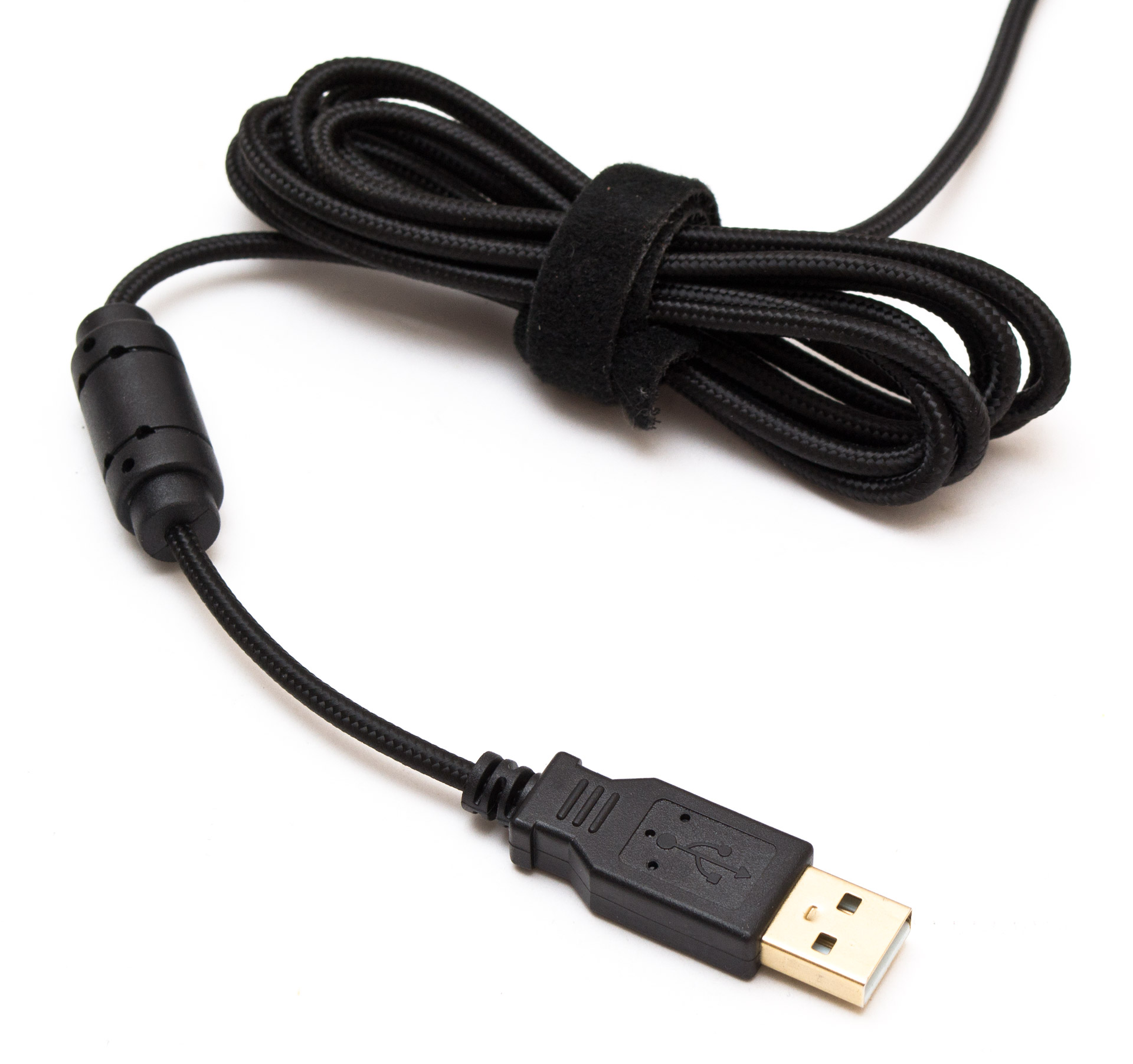 Слабое место в данной мыши — это шнур. Он довольно жесткий, легко запоминает и поддерживает заданную форму. Для комфортного использования ему нужен будет держатель. Длина кабеля составляет 1,8 метра, он снабжен нейлоновой оплеткой и ферритовым кольцом недалеко от USB-разъема. Есть на проводе и многоразовая липучая стяжка для регулировки его длины.