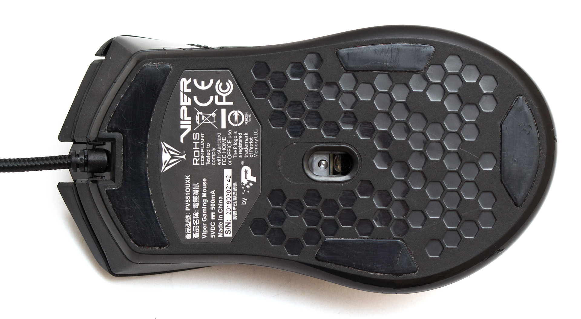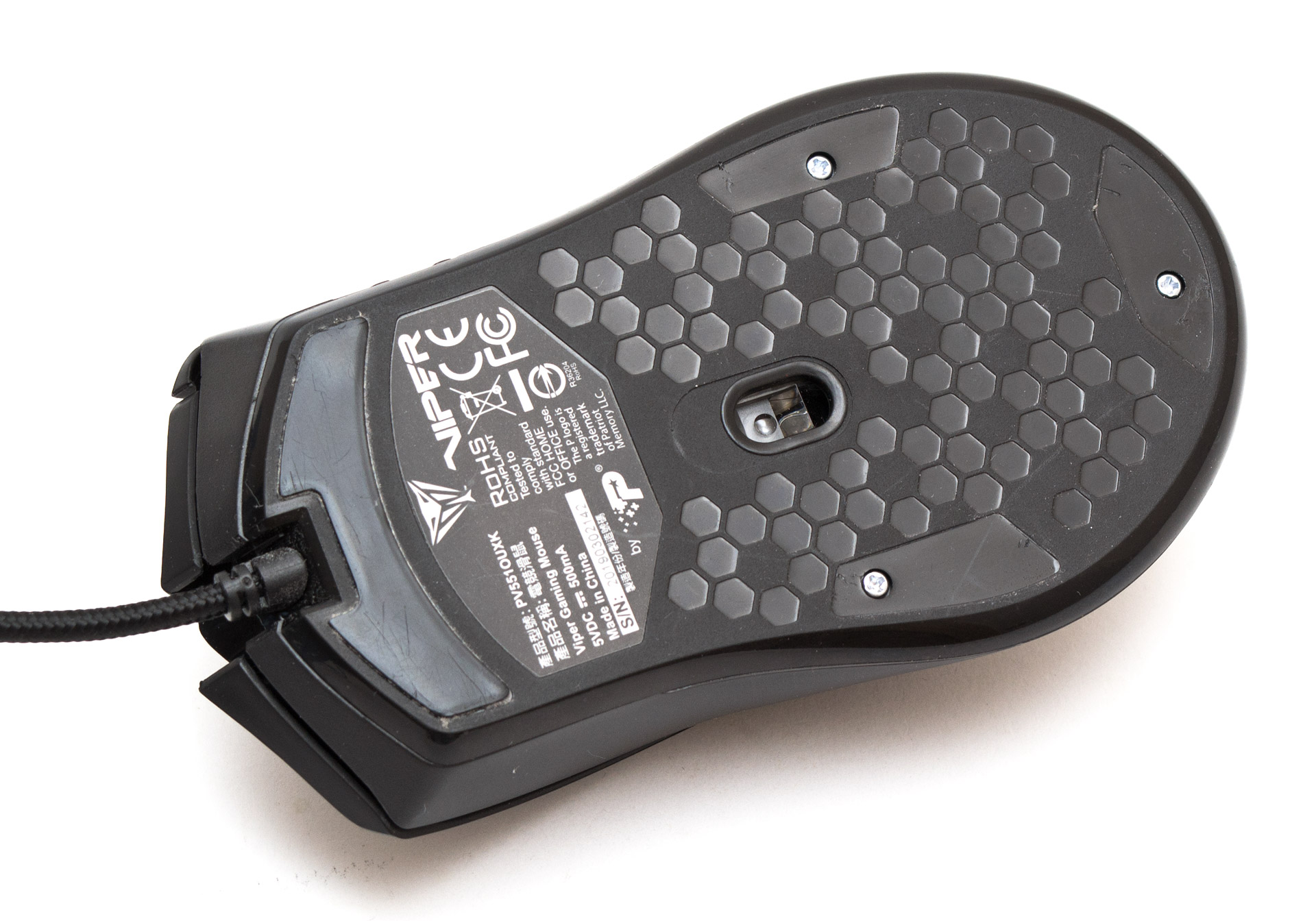 Большая часть основания мыши покрыта гексагональной глянцевой текстурой. Окошко оптического сенсора расположено ровно по центру. Четыре узкие ножки наклеены спереди, сзади и по бокам. Наклейка с серийным номером расположена возле передней ножки.