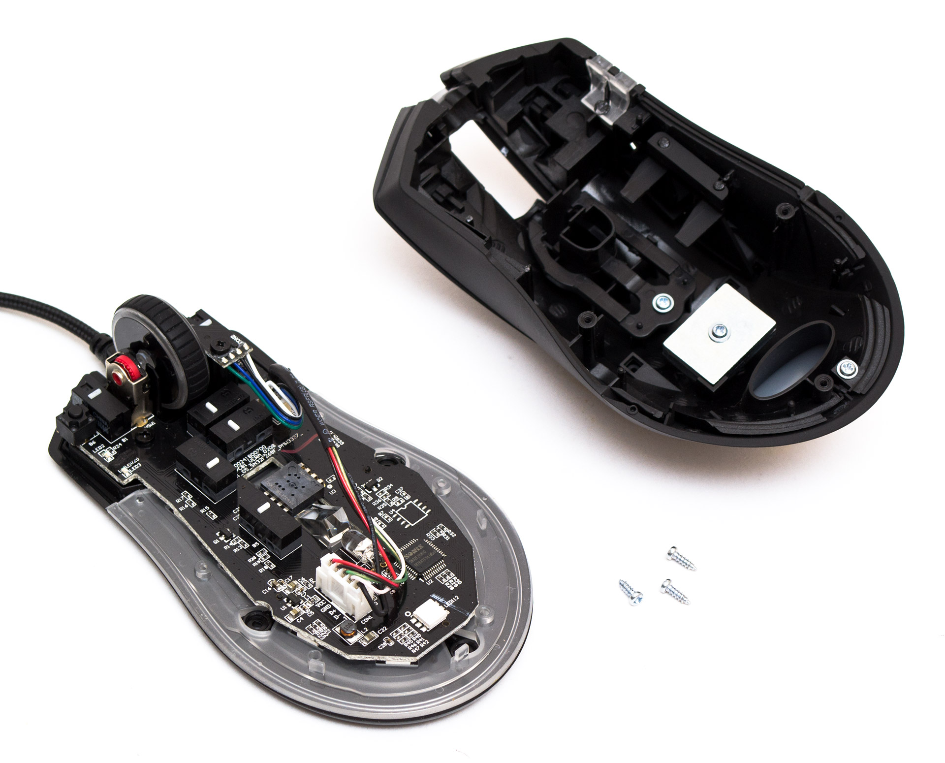 Под крышкой было обнаружено два грузика массой 7 грамм каждый. Если манипулятор кажется слишком тяжелым, можно их снять. В основании мыши находится вставка из прозрачного пластика для рассеивания света, а большинство светодиодов распаяны с обратной стороны печатной платы.