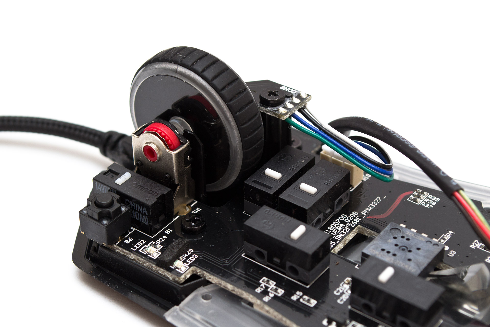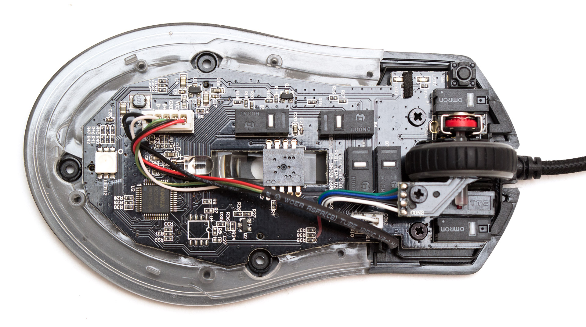 Под обеими боковыми кнопками, клавишами разрешения и профиля находятся механизмы Huano с белыми отбойниками. Под колесом прокрутки установлен TTC с красной кнопкой. Основные кнопки активируют переключатели Omron.