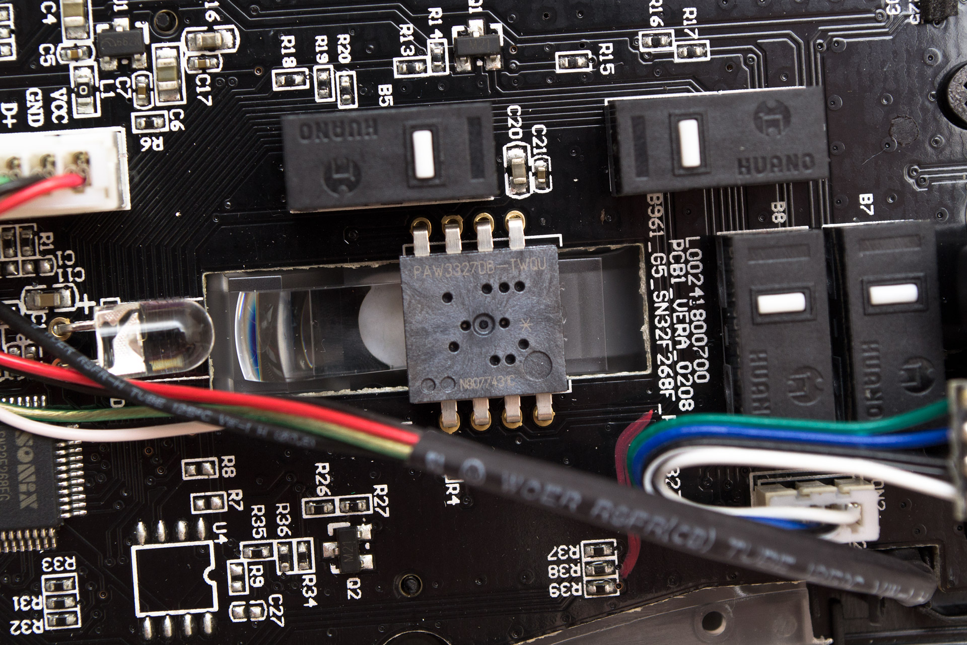 Как и было заявлено в официальных спецификациях, здесь распаян сенсор PixArt PAW3327DB-TWQU с внешним диодом инфракрасной подсветки.